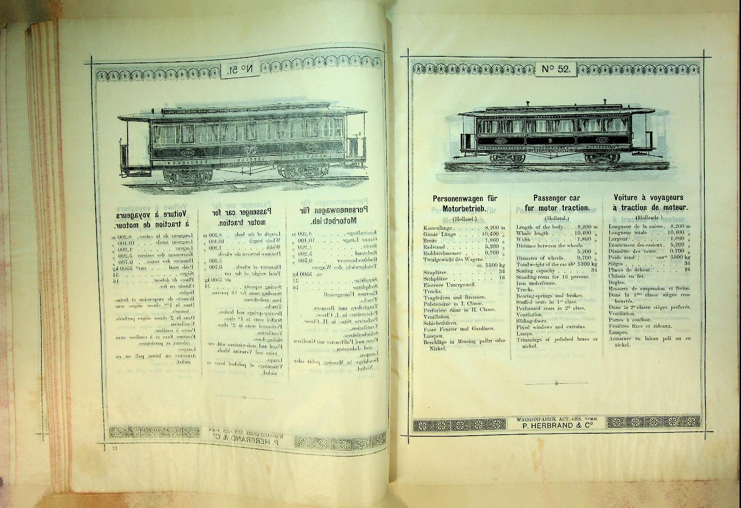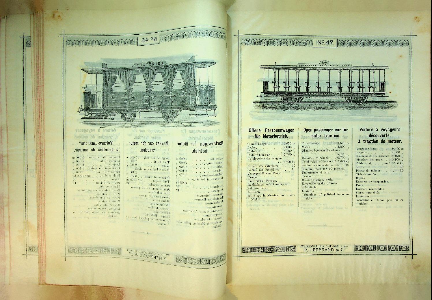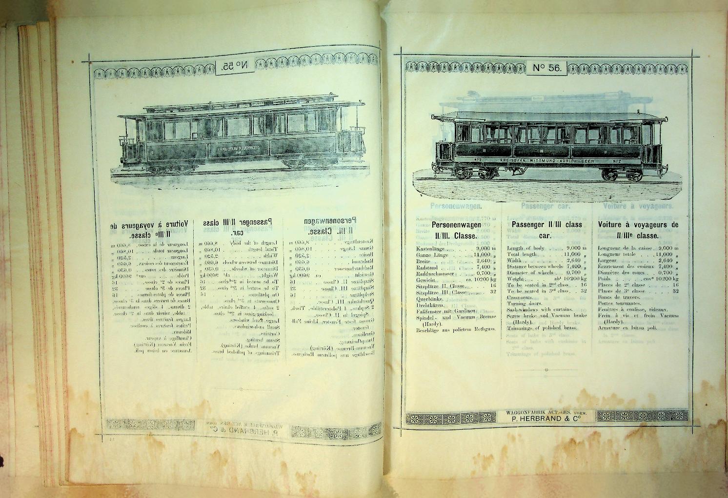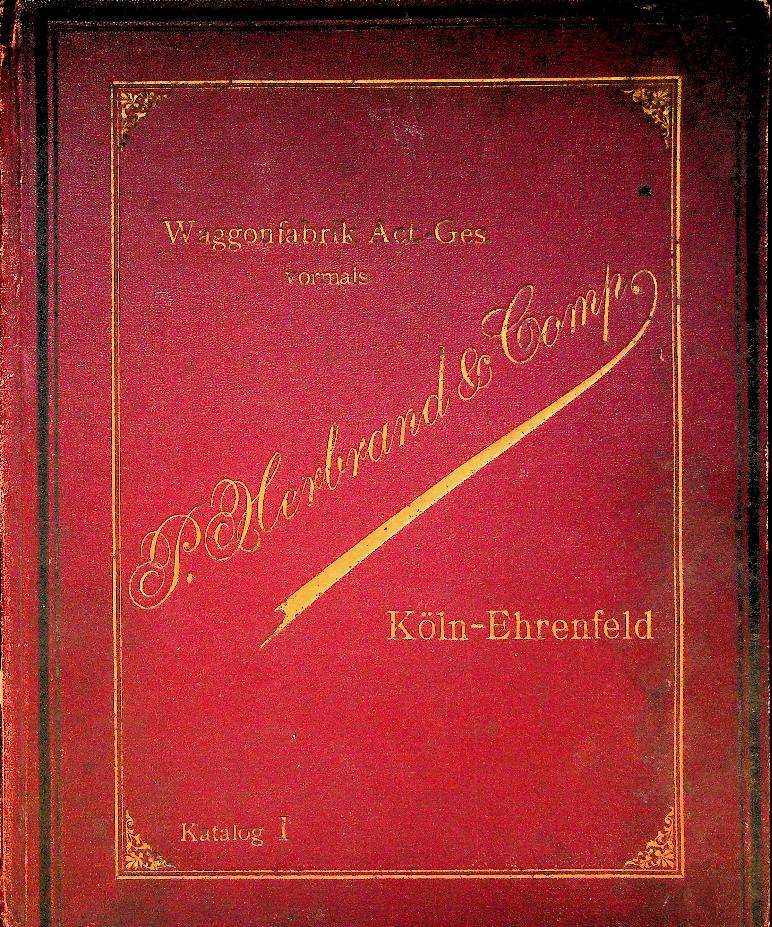Herbrand & Comp: Ca. 1890 Koln-Ehrenfeldt, hardcover 140 pages on ricepaper, one-side printing. Catalogue with all the Wagons made bij Herbrand for Train and Tram lines. Each Wagon a details side illustration and all the specifications of each wagon. Also a few pages with basic parts of the wagons. In German, English and French language. Herbrand was a German rolling stock builder based in Cologne-Ehrenfeld (founded 1866), producing freight wagons, passenger coaches, and tramcars for standard- and narrow-gauge railways across Germany and neighboring countries until its absorption in 1917 and final shutdown in 1928.. Very rare item