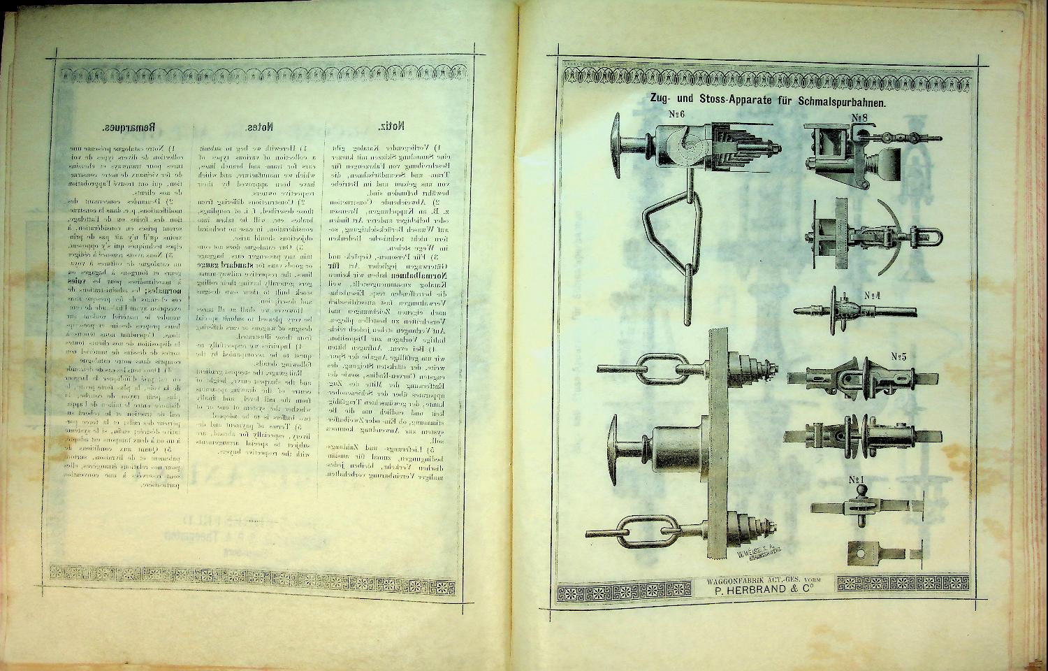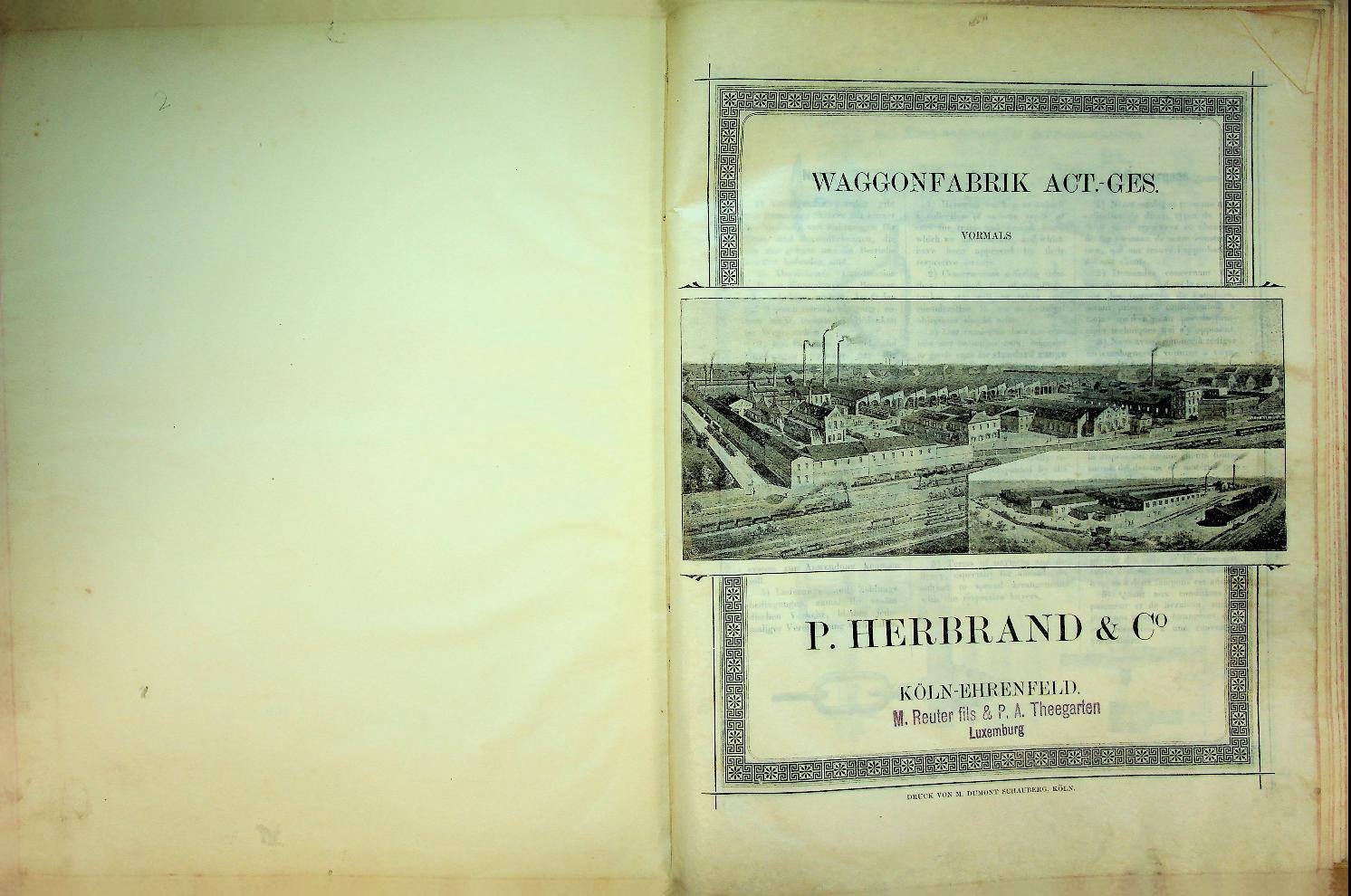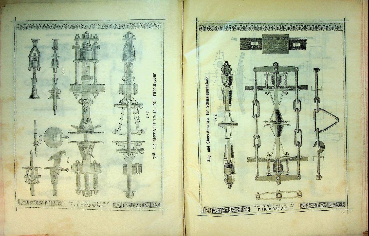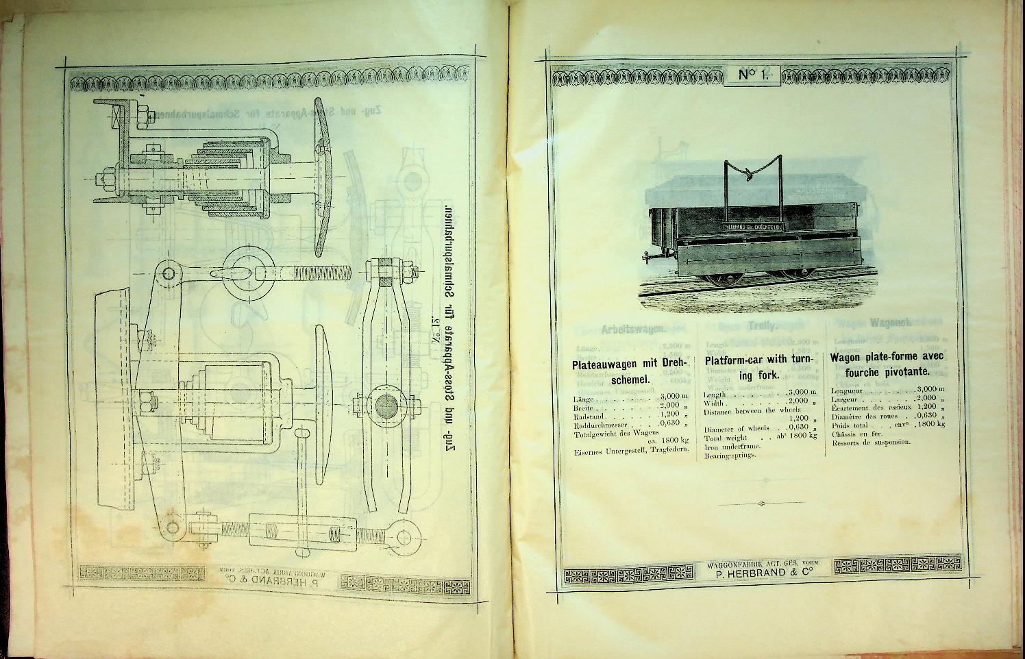 Herbrand & Comp: Ca. 1890 Koln-Ehrenfeldt, hardcover 140 pages on ricepaper, one-side printing. Catalogue with all the Wagons made bij Herbrand for Train and Tram lines. Each Wagon a details side illustration and all the specifications of each wagon. Also a few pages with basic parts of the wagons. In German, English and French language. Herbrand was a German rolling stock builder based in Cologne-Ehrenfeld (founded 1866), producing freight wagons, passenger coaches, and tramcars for standard- and narrow-gauge railways across Germany and neighboring countries until its absorption in 1917 and final shutdown in 1928.. Very rare item