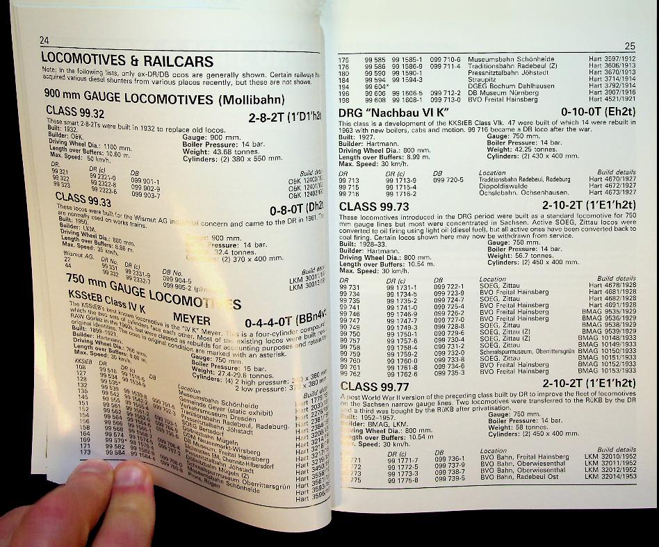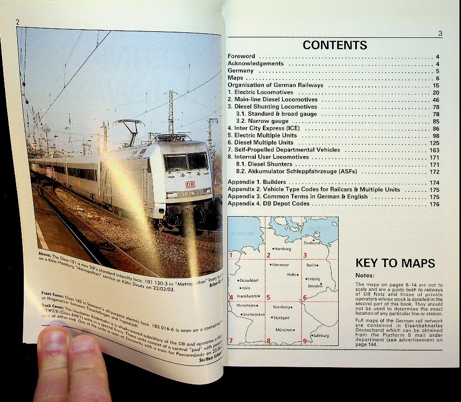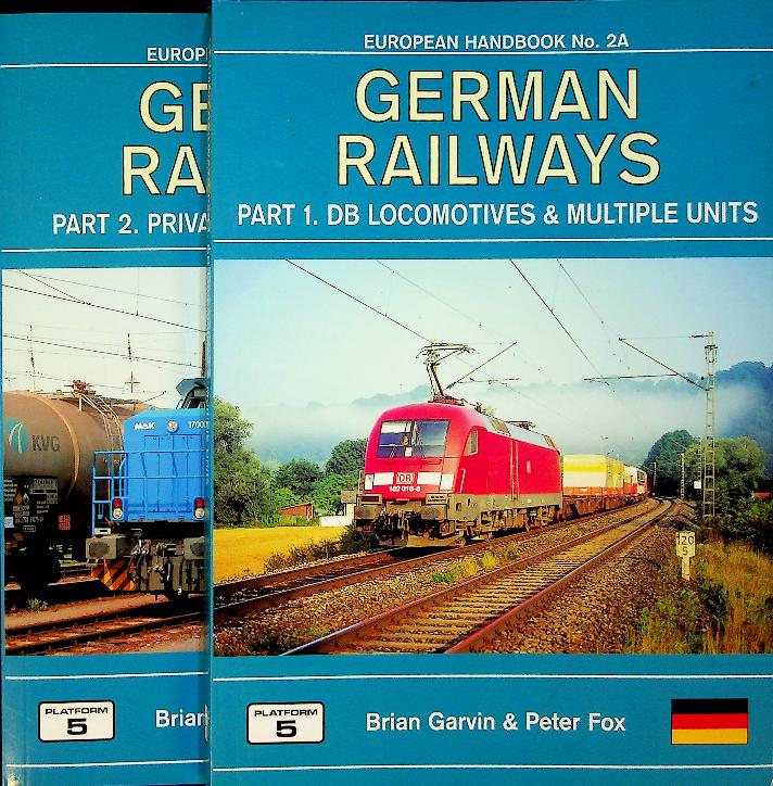 Garvin, B. and P. Fox: 2004 Platform 5 Germany, softcover, 176 + 224 pages, illustrated. German Railways (2 volumes) by Brian Garvin is a practical handbook set that catalogs German rolling stock: Part 1 covers all locomotives and multiple units of Deutsche Bahn with historical notes and detailed fleet lists, while Part 2 documents private operators, museums, and museum lines including vehicle keepers and builders’ appendices. Together, the pair offers an up-to-date reference to Germany’s passenger and freight scene, reflecting open-access competition and the diversity of modern and heritage equipment across the network. ISBN 9781902336367 and 9781902336374 In very good condition