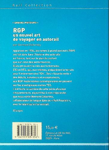 Collardey, B: 2005 Rail Passion France, softcover, 79 pages, illustrated with photos and track maps. richly illustrated history of the French “Rames à Grand Parcours” diesel multiple units introduced from 1954, explaining their design, routes, and role in long‑distance passenger services and in paving the way for later turbotrains and high‑speed developments. The book focuses on their technical features, deployment on major lines, and evolution in service, making it a concise reference for enthusiasts of French railway history. ISBN 9782915034356 / 2915034354 In very good condition. French language