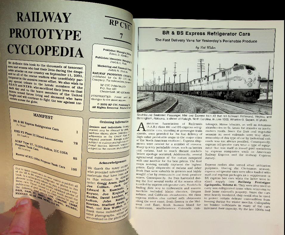 Wider, P.C.: 2002 USA, softcover, 104 pages, illustrated. specialist reference for North American railway modelers and historians, focusing in depth on AC&F Type 27 10,500-gallon propane tank cars, BR & BS express refrigerator cars, and EMD F3 Phase III diesel locomotives with extensive photos, diagrams, and rosters from roughly the steam–diesel transition era. It is part of the continuing RP CYC softcover series on U.S. freight and passenger equipment of the 1920s–1950s. In very good condition