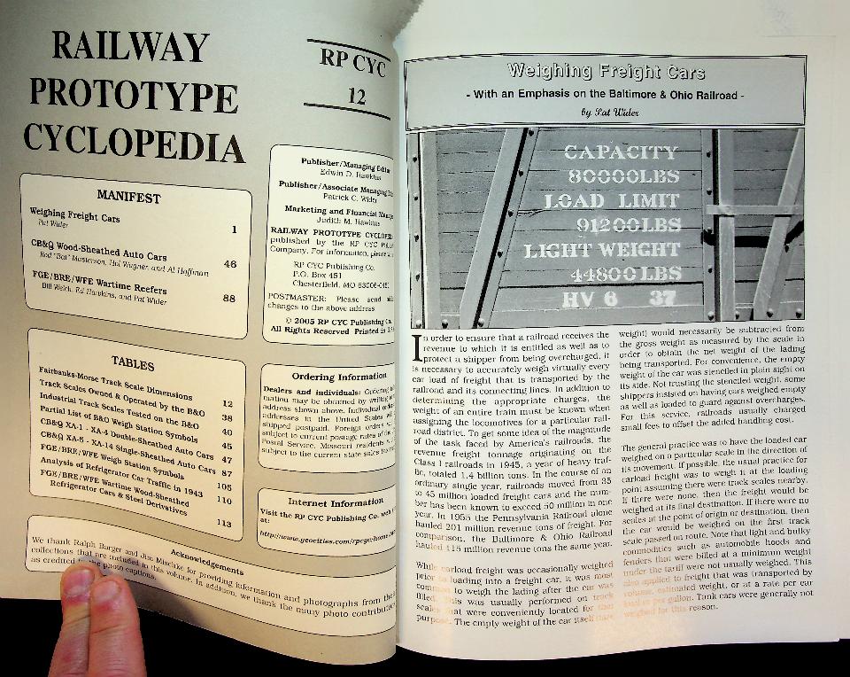 Wider, P.C.: 2005 USA, softcover, 113 pages, illustrated. Railway Prototype Cyclopedia RP CYC 12 is a softcover reference volume for North American prototype railroad modelers, focusing heavily on the weighing of freight cars, including track scales, scale test cars, scale tool cars, and related operating practices, illustrated with numerous prototype photos, plans, diagrams, and rosters from roughly the 1920s–1950s era. It is part of the ongoing RP CYC series edited by Ed Hawkins and Pat Wider and, like other volumes in the series, is designed as a detailed technical and photographic resource rather than a narrative text. In very good condition