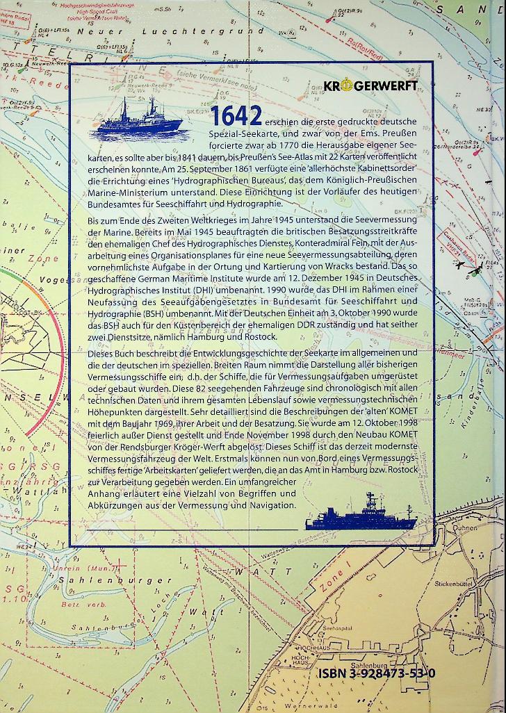 Deltlefsen, G.U. and HJ. Dubberke: 1998 Deutschland, hardcover 200 pages, with photo's and illustrations. History of the German Hydrographic Service and her Ships. 150 years of German hydrographic surveying, from early sailing survey vessels using manual sounding methods to modern research ships equipped with advanced electronic navigation and data-processing technology. The book combines technical, institutional and maritime-historical perspectives, richly illustrated with photographs and drawings of ships, instruments and survey operations. ISBN 9783928473538 In very good condition