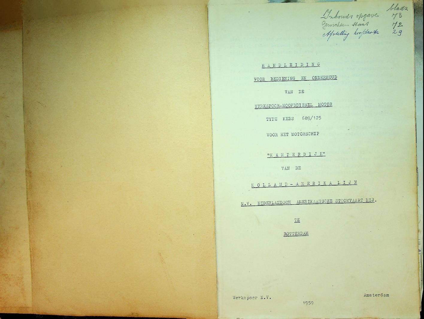 Werkspoor: 1959 Amsterdam, hardcover 75 blz. + ongeveer 40 uitvouwbare platen van de technische installatie. Handleiding voor de bediening en het onderhoud. De Ms Kamperdijk was een schip van de Holland-Amerika Lijn. Met sporen van gebruik