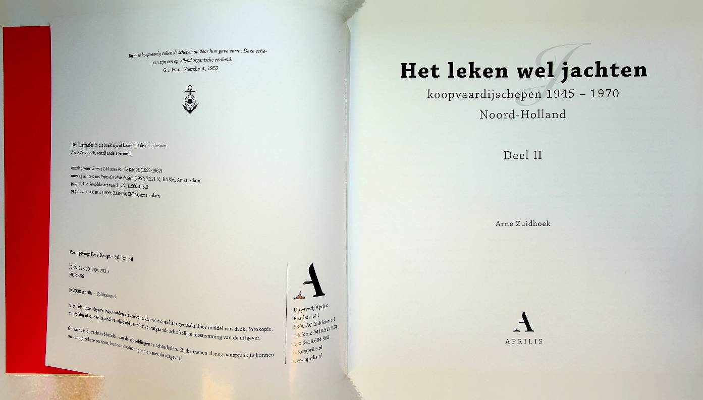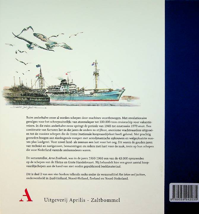 Zuidhoek, Arne: 2008 Aprilis, 2006 Zaltbommel, hardcover 132 blz., mooi fotoboek met achtergronden. Het boek toont de Noord-Hollandse koopvaardijschepen uit 1945–1970 als elegant vormgegeven “jachten”, met slanke rompen, aerodynamische opbouwen en rijk beeldmateriaal, waarbij vooral Amsterdamse rederijen als SMN en KNSM en de ontwerpkracht van Amsterdamse bouwbureaus centraal staan. Arne Zuidhoek selecteert en beschrijft een groot aantal schepen van Noord-Hollandse origine, aangevuld met zijn tekeningen en niet eerder gepubliceerd beeldmateriaal, als deel 2 binnen de reeks Het leken wel jachten. ISBN 9789059942035 Koopvaardij, scheepvaart. In zeer goede staat