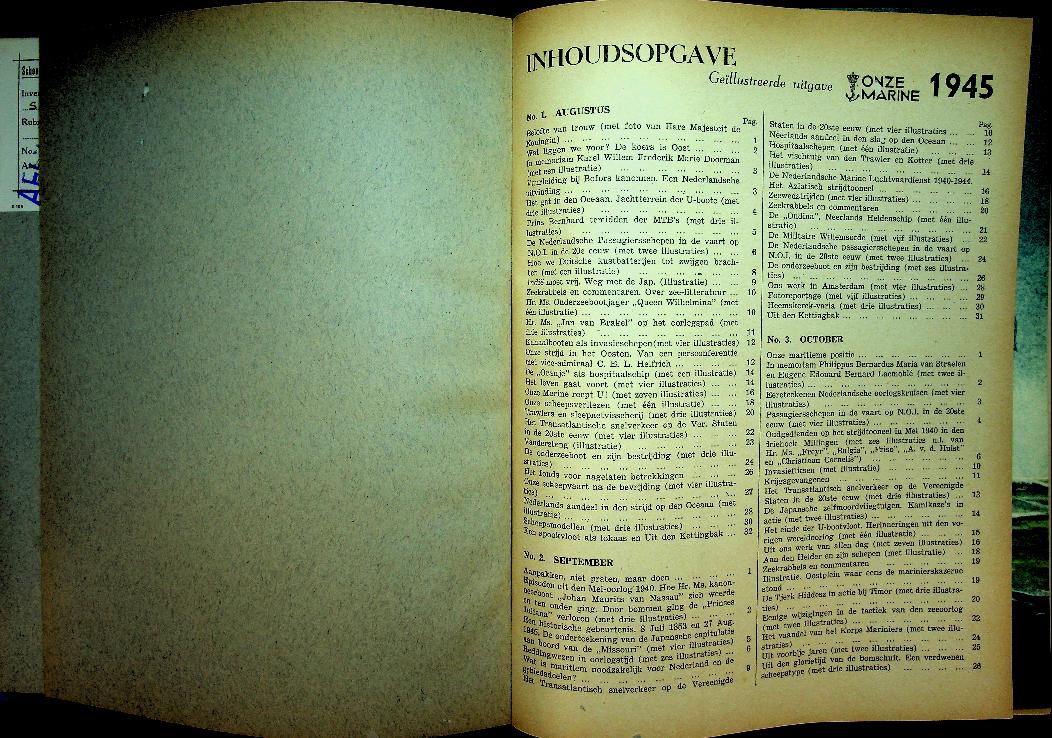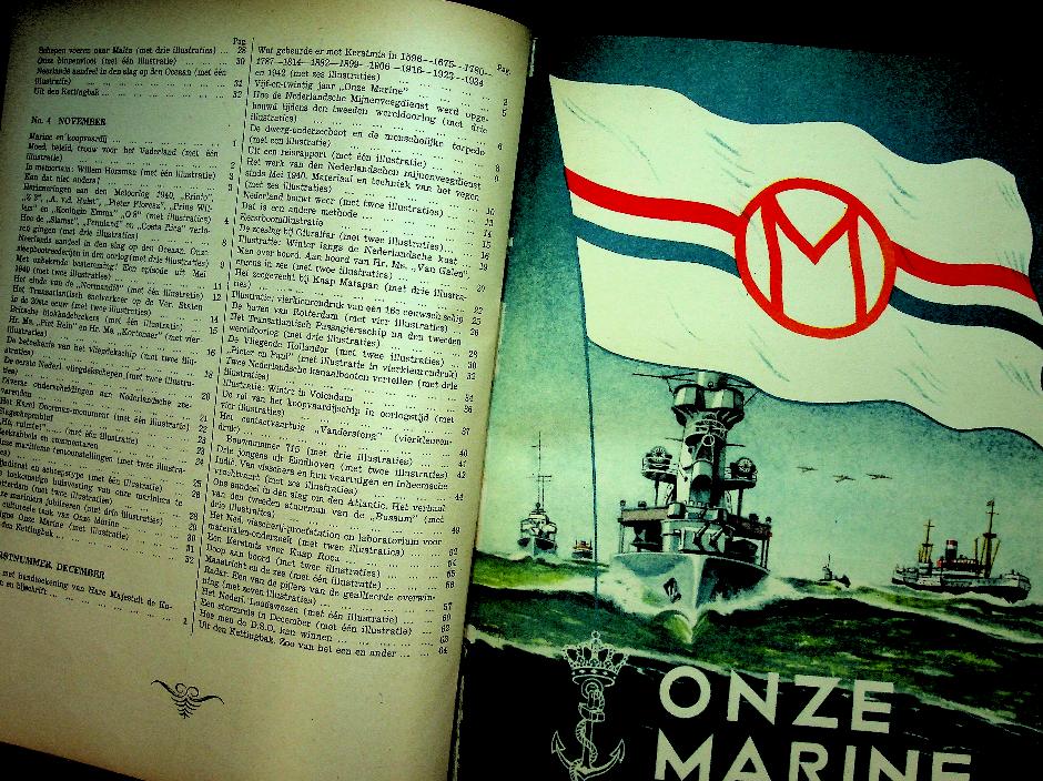 Onze Marine: 1945 s-Gravenhage, hardcover, ingebonden, ca. 250 blz., geïllustreerd, met inhoudsopgave van het hele jaar. Onze Marine 1945 bracht speciale edities zoals het bevrijdingsnummer en een Kerstnummer met terugblik op de oorlogsjaren, de rol van de Koninklijke Marine in bevrijding en repatriëring, en fotoreportages en artikelen over schepen, eenheden en inzet in 1940‑1945. De jaargang positioneert de Marine aan het einde van de Tweede Wereldoorlog en de start van de wederopbouw, met documentatie en beeldmateriaal over operaties, scheepstypen en personeelservaringen rond 1945, aansluitend bij archiefdossiers en naslagwerken over Marine-activiteiten en vloot na 1945. In zeer goede staat