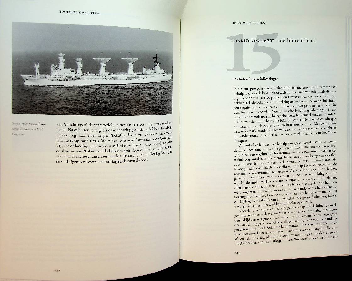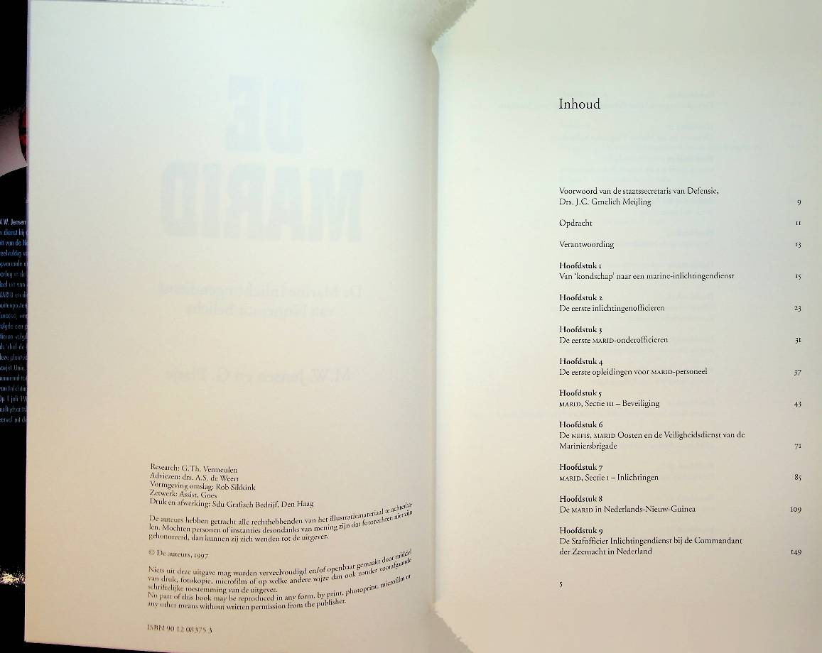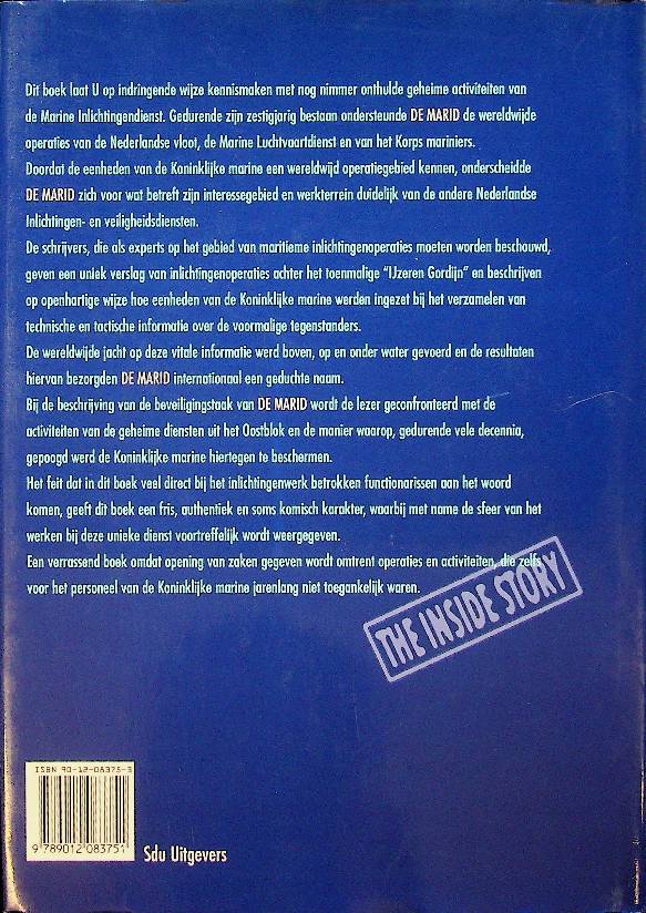 Jensen, M.W./Platje, G: 1997 Den Haag, hardcover met papieromslag 422 blz. Geschiedenis van de Marid, met foto's en index. De MARID van M.W. Jensen en G. Platje beschrijft van binnenuit de geheime operaties en werkwijze van de Nederlandse Marine Inlichtingendienst, met bijzondere aandacht voor de Koude Oorlog en de inzet in Nederlands-Indië en Nieuw-Guinea. Het boek laat zien hoe deze dienst informatie verzamelde op en onder zee, welke spionagemethoden werden gebruikt en welke politieke en militaire betekenis dit had voor het Nederlandse veiligheidsbeleid. ISBN 9789012083751 / 9012083753 in zeer goede staat.