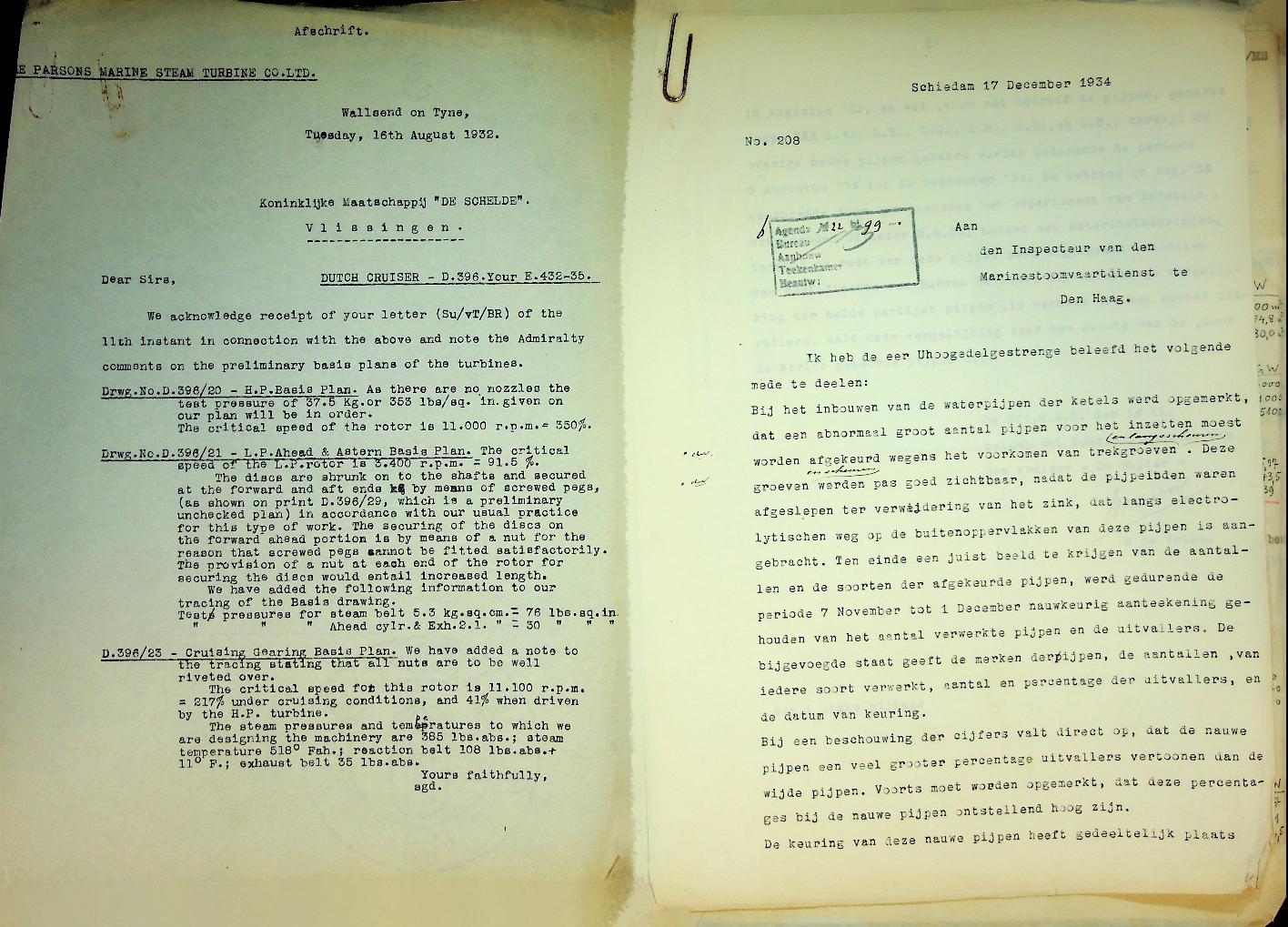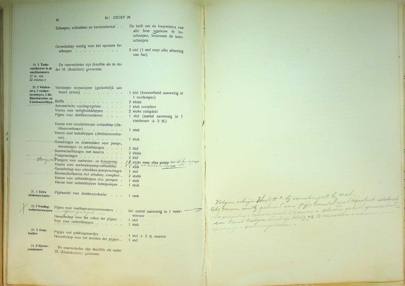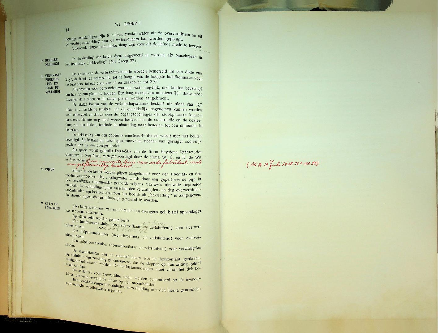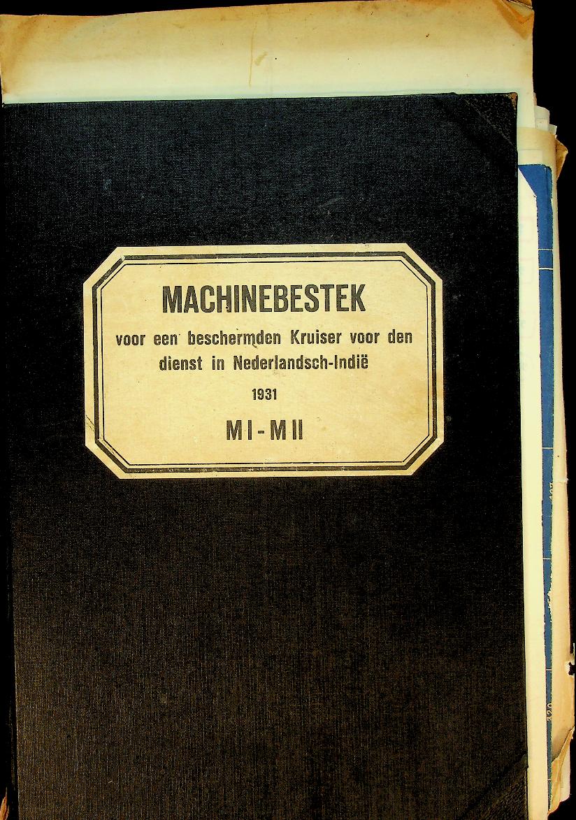 Auteur onbekend: In drie delen, met als officiele titel op elke hardcovermap, Scheepsbestek voor een beschermden kruiser voor den dienst in Nederlandsch-Indie. 1e deel, Scheepsbestek S1-4 van het IVS, met daarin de complete bouwrichtlijnen voor het te bouwen schip, gekartonneerd 124 blz. 2e deel, Machine bestek MI-MII, +/- 120 blz. M1 betreft, de motoren, M2 betreft de scheepshulpmachines. met daarbij de correspondentie over een aantal zaken betreffende de bouw van het schip (latere jaren gedateerd) van De Schelde, Wilton-Fijenoord Yarrow and Co Glasgow. M III, dit derde deel betreft de electrische installatie, hardcover 101 blz..,. Het gehele bestek van dit schip is compleet. In de bijbehorende correspondentie heeft men het over ''De Ruyter'', waaruit blijkt dat dit scheepsbestek voor de latere De Ruyter is.