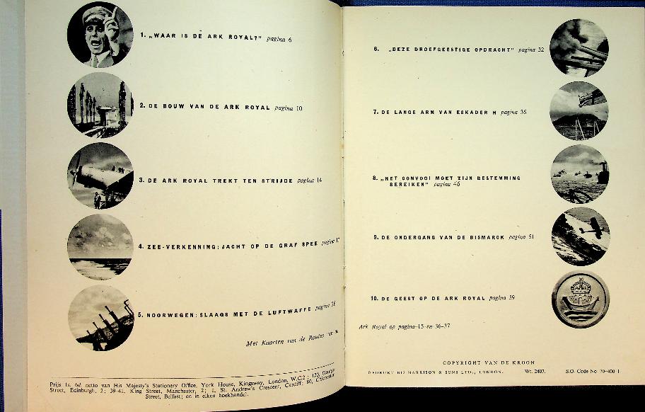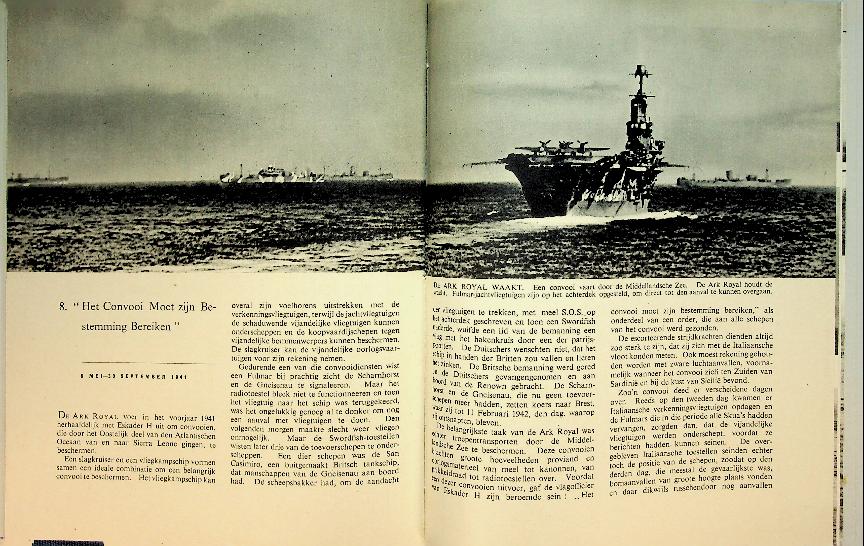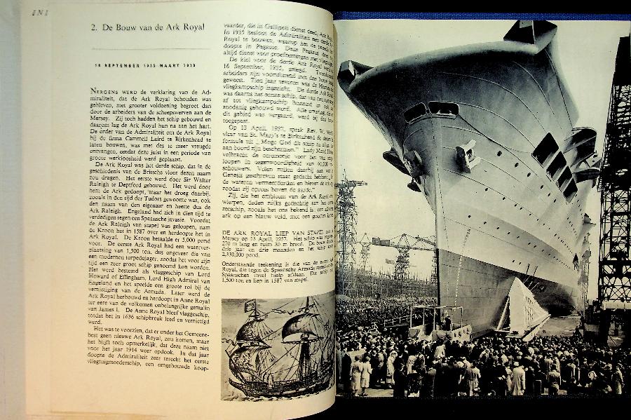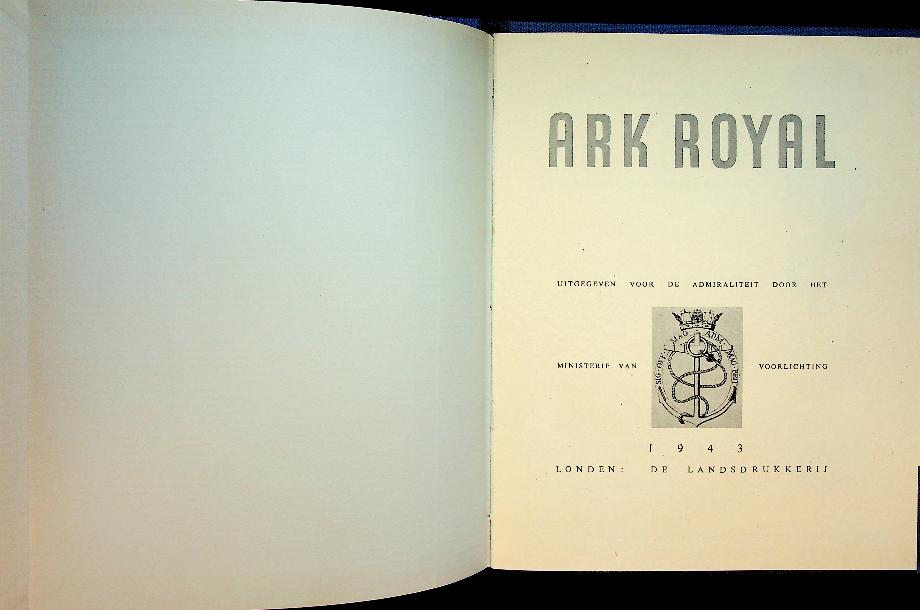 Ministerie van voorlichting: 1943 De Landsdrukkerij London, hardcover 64 blz., met foto's. Vanuit het Vrije London deze Nederlandse uitgave over de prestaties van de Ark Royal in WO2 en haar ondergang in 1941 door een Duitse torpedo. In zeer goede staat