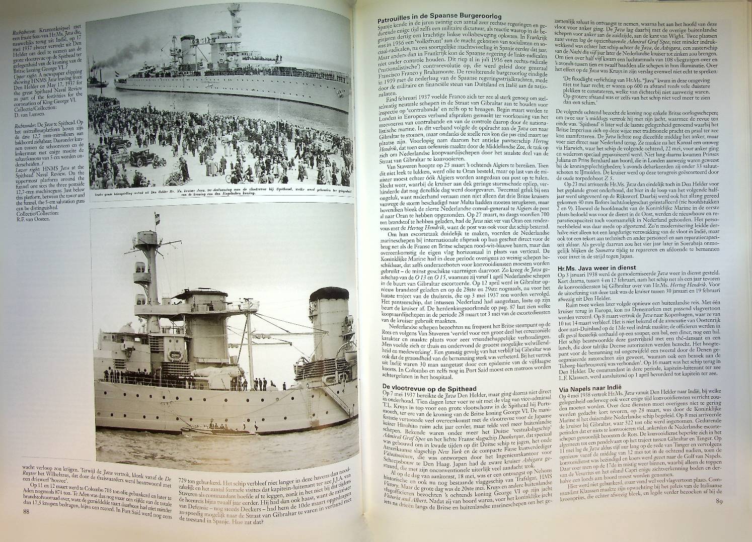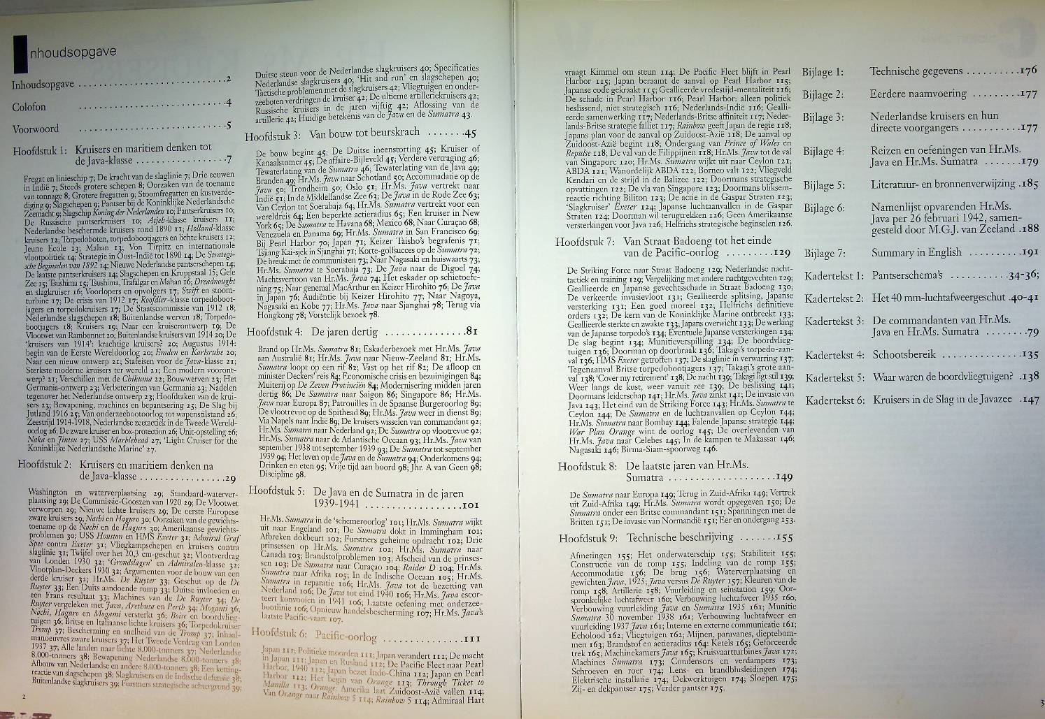 Anten J. e.a.: 2001 Zierikzee, hardcover 192 blz.. Prachtig boek met vele achtergronden en afbeeldingen. Over de schepen en hun levensloop. Hr.Ms. Kruisers ‘Java’ en ‘Sumatra’ beschrijft in woord en beeld de volledige levensloop van beide lichte kruisers van de Koninklijke Marine, van ontwerp en bouw tot hun inzet in Nederlands-Indië en hun ondergang in de Slag in de Javazee. Het rijk geïllustreerde boek bevat foto’s, tekeningen en scheepsbiografieën en plaatst de schepen in hun tactische en historische context binnen de Nederlandse marine geschiedenis. ISBN 9789074861182 / 9074861180 Scheepvaart, Marine, Javazee. In zeer goede staat