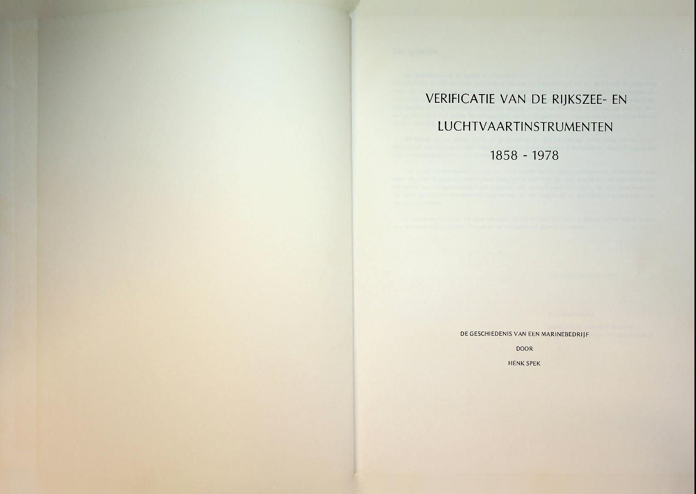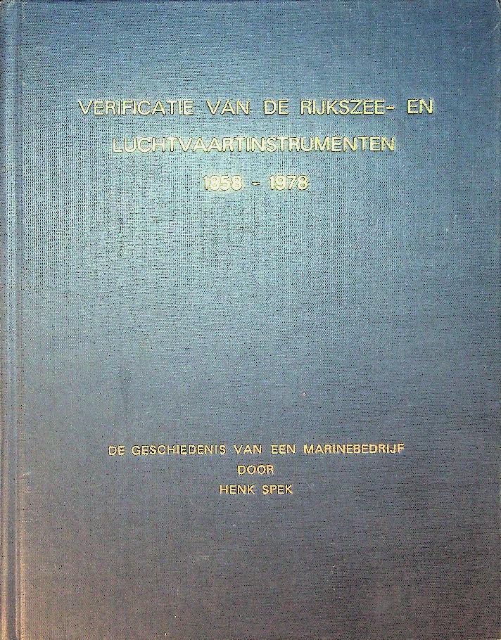 Spek, Henk: 1978 Koninklijke Marine Oegstgeest, hardcover 140 blz., met foto's. Een goede gedetailleerde geschiedenis van dit speciale marinebedrijf. Dit boek van Henk Spek beschrijft de geschiedenis van het Nederlandse marinebedrijf voor de verificatie en kalibratie van zee- en luchtvaartinstrumenten, van de oprichting in 1858 tot de fusie en het einde van de dienst in 1978. Het behandelt het belang van precisie-instrumenten voor navigatie, wetenschappelijk onderzoek en defensie, en de rol van technologische innovatie binnen de marine. In zeer goede staat