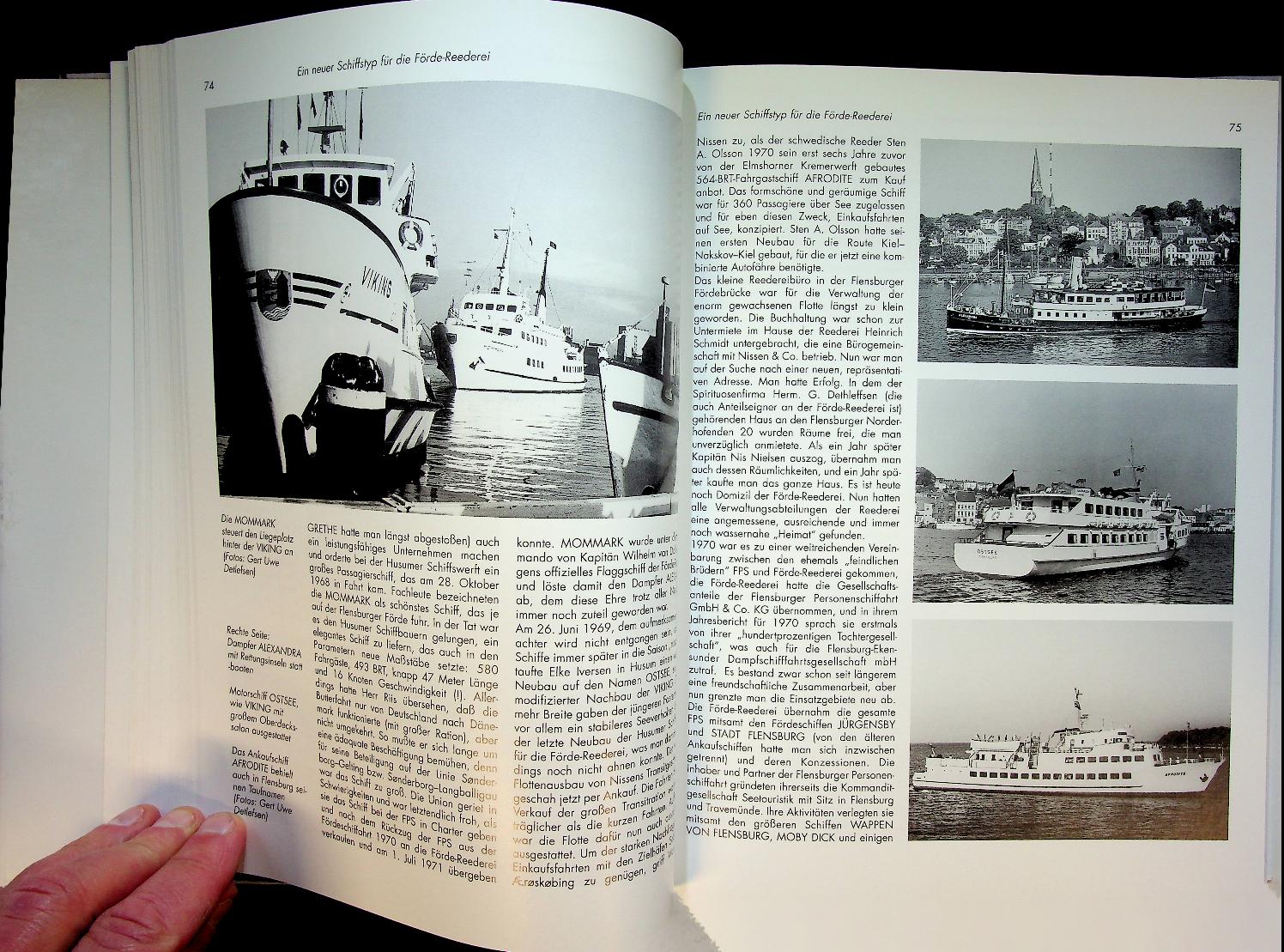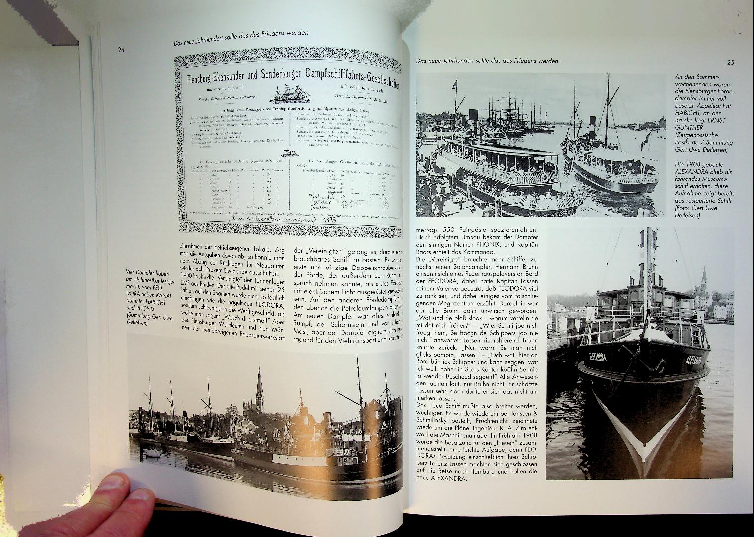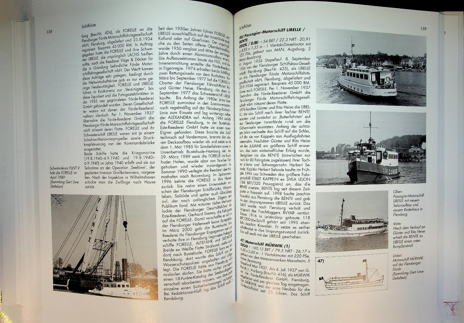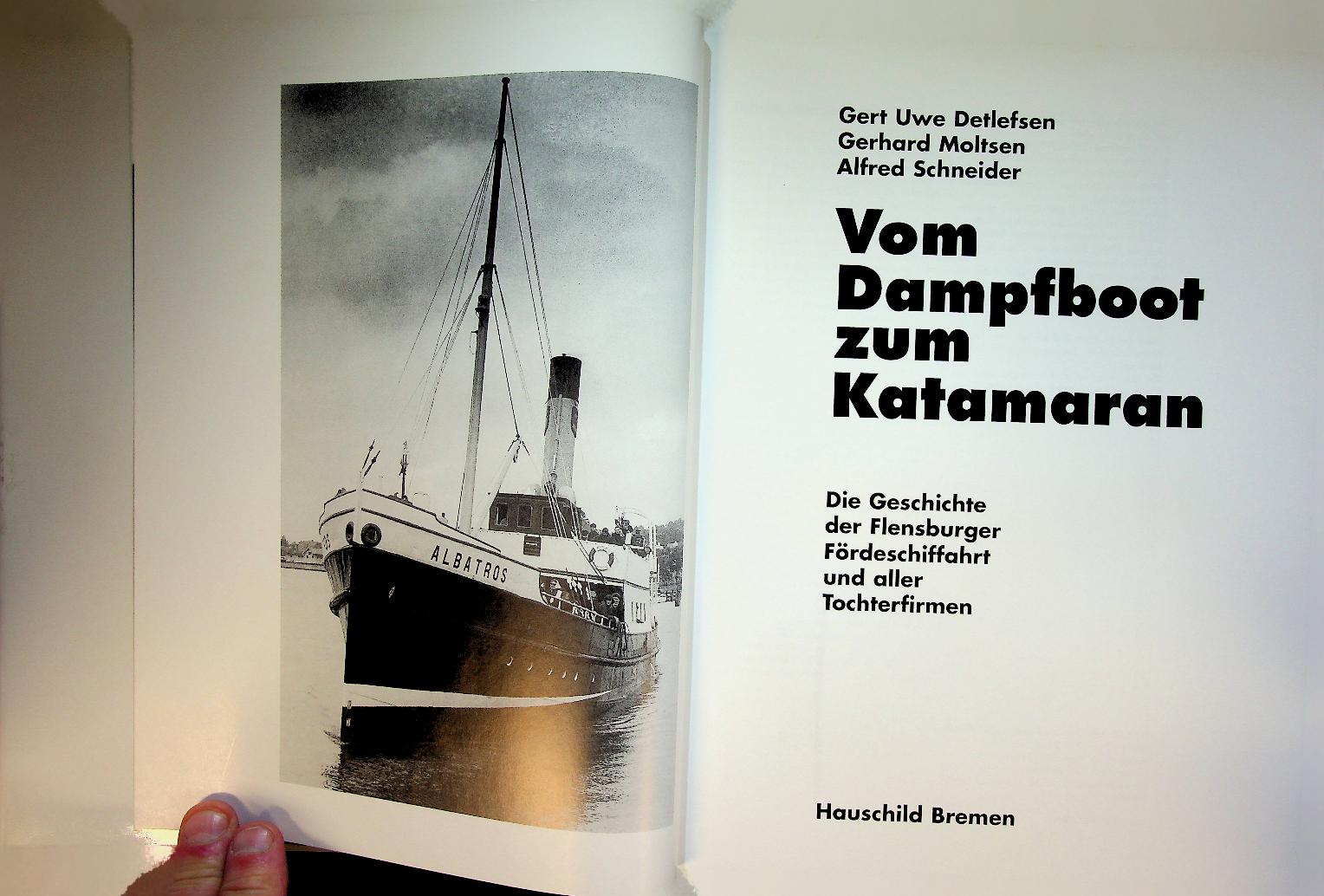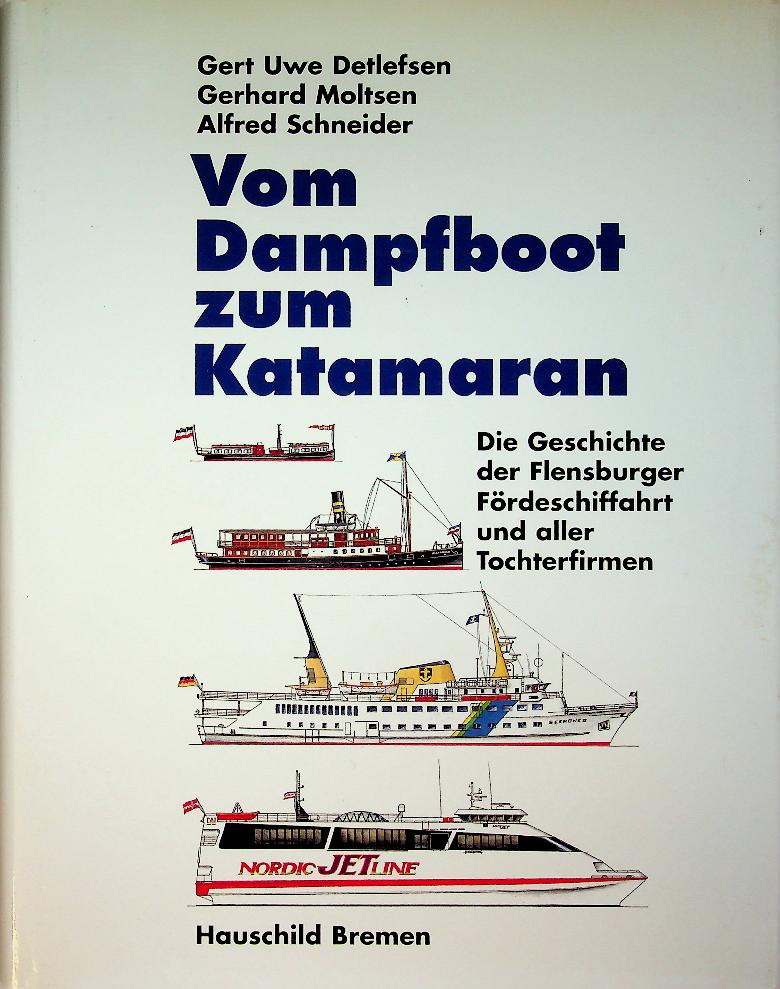 Detlefsen, G.U. a.o.: 2000 Bad Segeberg, hardcover with dustjacket 267 pages. History and large historical fleet list with photo's of the ships and details. Vom Dampfboot zum Katamaran traces the history of the Flensburg Fjord shipping company, documenting its development from early steamboats to modern catamarans and the evolution of its fleet and services. The book also covers the various subsidiary companies, providing detailed insights into regional maritime transport, ship types, and economic changes along the Flensburg Fjord. ISBN 9783897570795 / 3897570793 In very good condition.