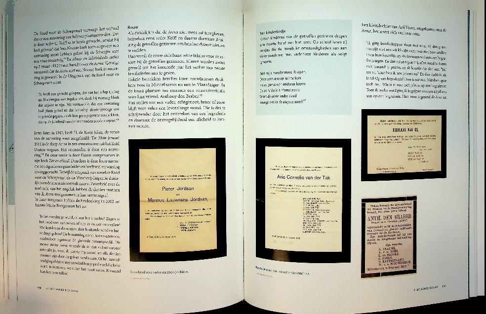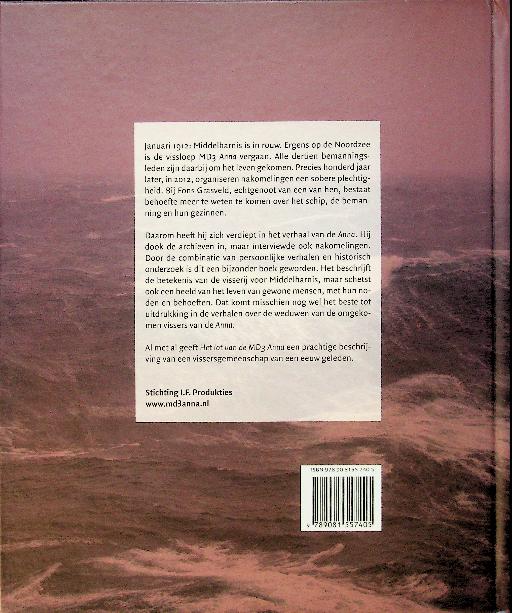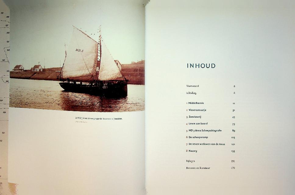 Grasveld, F: 2014 Hilversum, hardcover 174 blz., geïllustreerd. Het boek vertelt het verhaal van de vissloep MD3 Anna, die met dertien bemanningsleden in januari 1912 bij Middelharnis verging. Het boek schetst de tragedie, de omstandigheden van de ramp en de impact op het vissersdorp. ISBN 9789081557405 In zeer goede staat