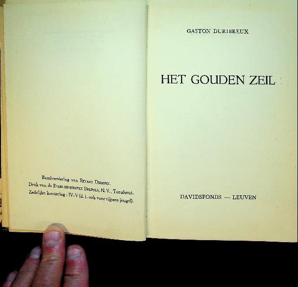 Duribreux, G: 1950 Belgie, hardcover, 239 blz. Het gouden zeil is een vissersroman van Gaston Duribreux over het generatieconflict tussen een zoon die voor een leven aan de wal kiest en zijn vader die de zee trouw wil blijven, gesitueerd in het maritieme milieu waarvoor Duribreux bekend staat.