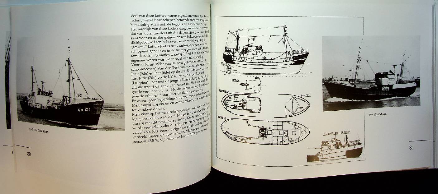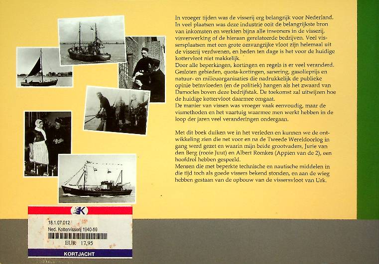 Berg, Jurie van den: softcover 128 blz. Van oudsher is de visserij erg belangrijk voor Nederland. Er zijn veel plaatsen waar deze industrie ooit de belangrijkste bron van inkomsten was en soms nog is. De manier van vissen was vroeger vaak eenvoudig, maar de vismethoden ontwikkelden zich steeds verder. Het schip, de kotter, was daarbij oorspronkelijk een rondspant zeilscheepje, met een lage en ronde achtersteven. Het had een mast met daaraan meerdere zeilen. In de loop van de tijd hebben zeilen plaatsgemaakt voor de dieselmotor. Binnen de Nederlandse visserij is de kottervisserij, onder te verdelen in de sectoren kustvisserij en zeevisserij, een belangrijk segment. De kotters zijn voornamelijk actief op de Noordzee en de Waddenzee. De belangrijkste vissoorten die men binnenbrengt zijn tong, schol en garnalen. Met Nederlandse Kottervisserij in beeld laat Jurie van den Berg de lezer kennismaken met dit belangrijke segment van de Nederlandse visserij. Een fotoboek dat met name de na-oorlogse periode belicht, waarbij er een enorme technische vooruitgang plaatsvond. ISBN 9789086160082 In zeer goede staat