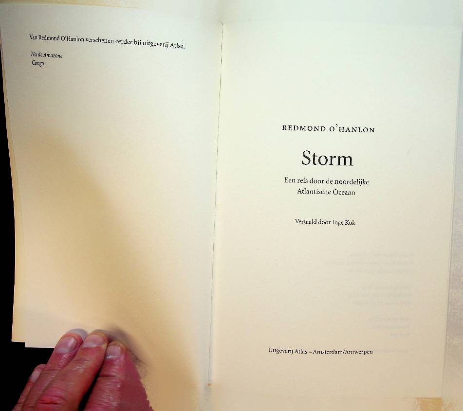 Hanlon, Redmond O: 2003, Amsterdam paperback 347 blz., met foto's. Aan boord van het enige vissersschip, die ook bij een orkaan uitvaart. Storm van Redmond O’Hanlon beschrijft in levendig reisproza zijn barre tocht met een visserschip over de noordelijke Atlantische Oceaan langs de Orkney-, Shetland- en Faeröer-eilanden, waarbij natuurkrachten, zeevaart en excentrieke bemanningsleden centraal staan ISBN 9789045014340 in zeer goede staat (afbeelding andere editie)
