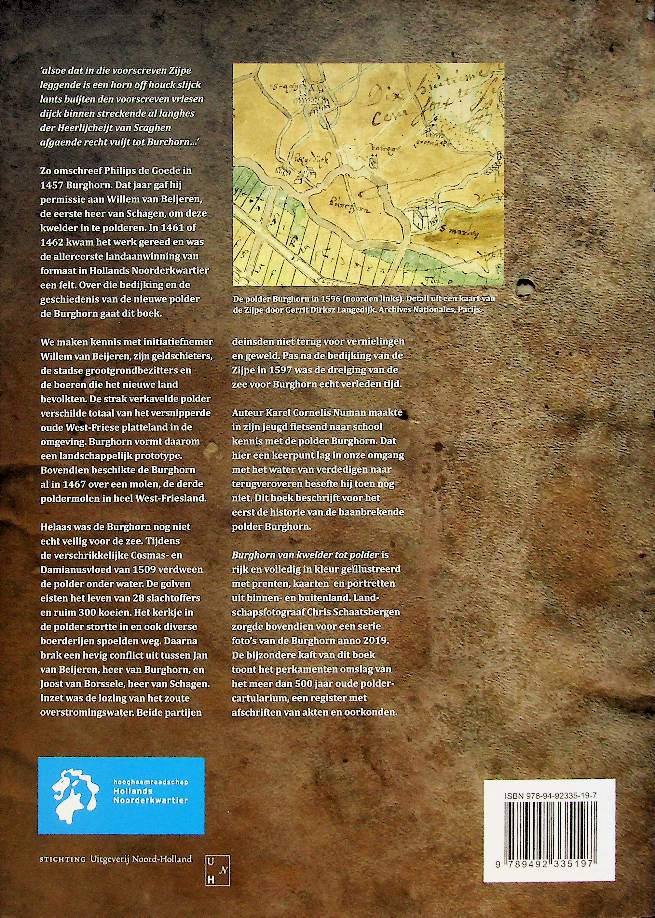 Numan, K.C.: 2019 Schagen, softcover, 90 blz, met vele afbeeldingen en oude kaarten. Burghorn, van kwelder tot polder van Karel Cornelis Numan beschrijft de eerste grote landaanwinning in het Hollands Noorderkwartier rond 1461, toen de buitendijkse kwelder Burghorn op initiatief van Willem van Beieren werd bedijkt en tot polder werd ingericht. Het boek volgt de geschiedenis van deze polder van de bedijking, de bouw van een vroege poldermolen en de korte bloei als nederzetting tot de verwoestende Cosmas- en Damianusvloed van 1509, waarbij Burghorn grotendeels weer door de zee werd weggevaagd. ISBN 9789492335197 In zeer goede staat
