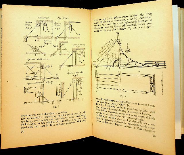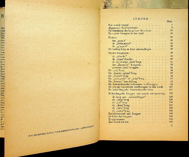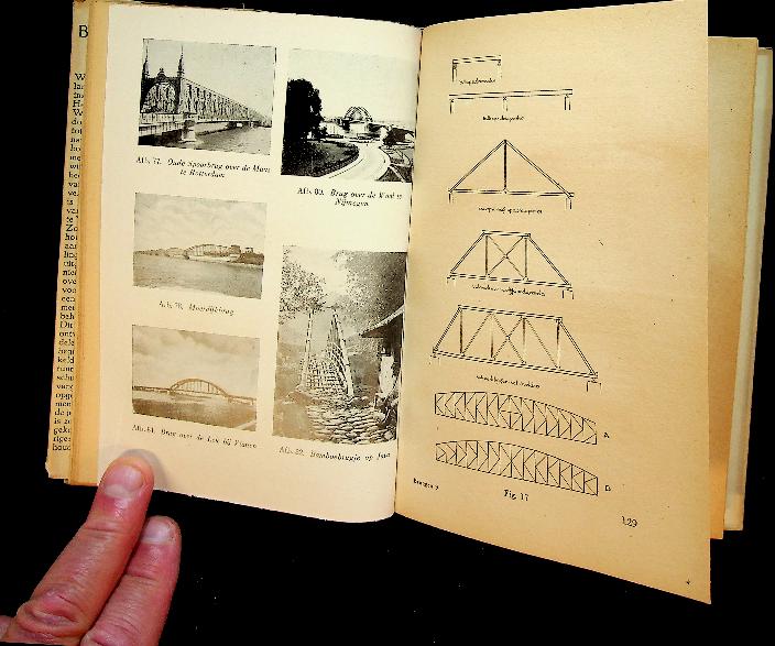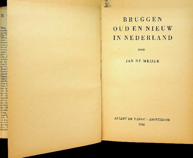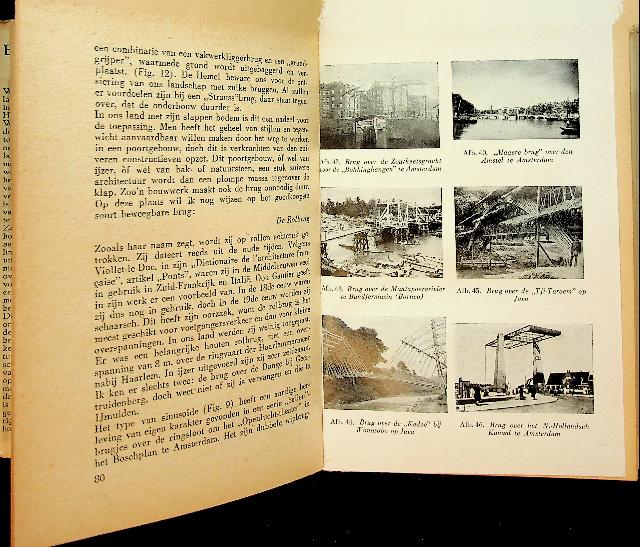 Meijer, Jan de: 1946 Heemschutserie, hardcover met papieromslag, 174 blz., geïllustreerd. Het boek schetst een rijk geïllustreerd overzicht van Nederlandse bruggen van historische bakstenen welfbruggen tot moderne staal- en betonconstructies zoals die in de eerste helft van de 20e eeuw werden ontworpen, met bijzondere aandacht voor vorm, materiaalkeuze en inpassing in het stadsbeeld, vooral in Amsterdamse grachtengebieden. Vanuit onze tijd bezien leest het als een pleidooi voor behoud en kwaliteit: het waardeert de rationele eenvoud en duurzame schoonheid van klassieke brugtypen terwijl het tegelijk een vroeg document is van monumentenzorg waarin esthetiek en functionaliteit als tijdloze maatstaven worden neergezet. In zeer goede staat