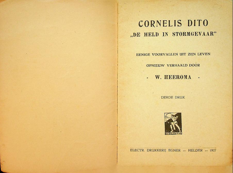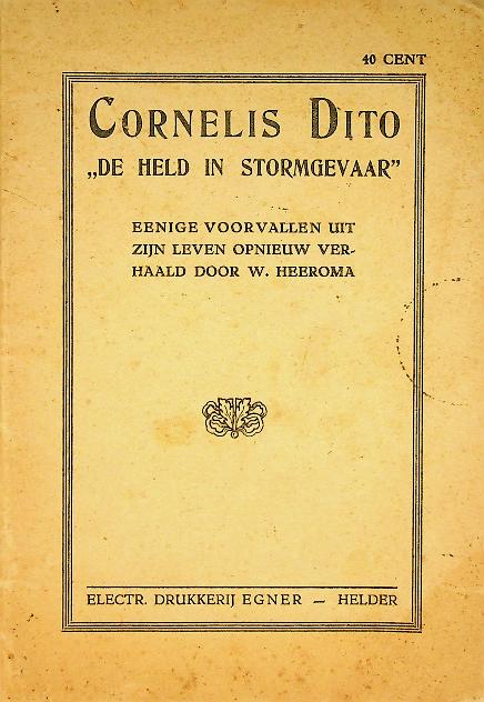 Heeroma, W: +/- 1925 Egner Helder, softcover 38 blz., met een paar foto's. Deeltje uit De Helden der Zee Fonds Dorus Rijkers. Een beknopt heldenboekje uit 1925 beschrijft Cornelis Dito als “de held in stormgevaar”, waarbij enkele dramatische voorvallen uit zijn zeemansleven in Den Helder populair-educatief worden naverteld om moed en plichtsbesef te illustreren. Het deeltje, geschreven door W. Heeroma en uitgegeven te Helder, maakt deel uit van uitgaven ten bate van het Helden-der-Zee-fonds “Dorus Rijkers” en sluit aan bij lokale herinneringscultuur rond zeemansheldendom. In zeer goede staat