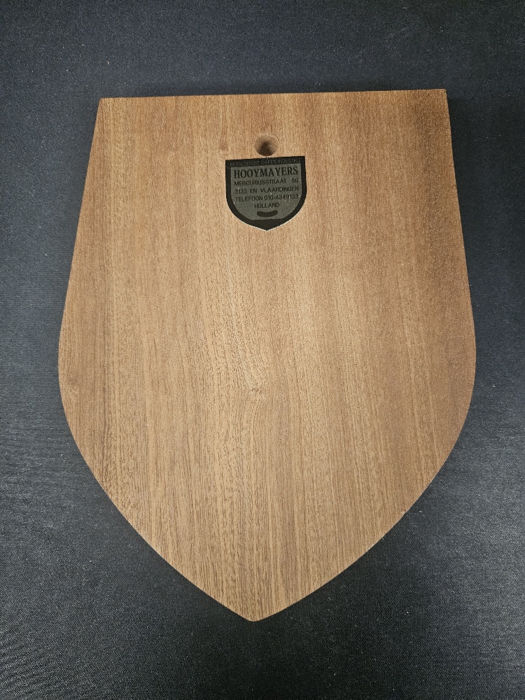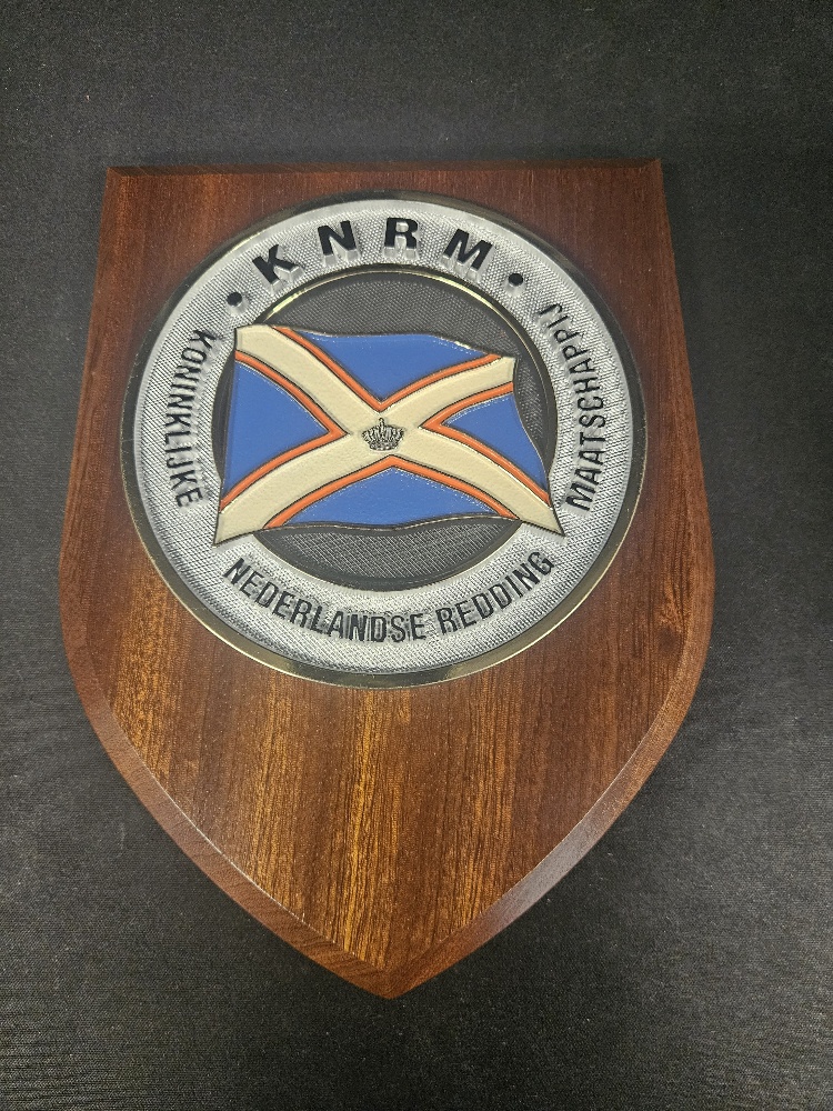 KNRM: Kunststof wapen op teakhouten schild. In zeer goede staat. Zware kwaliteit