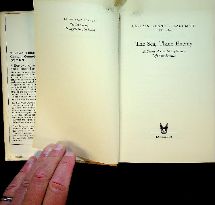 Langmaid, K: 1966 Jarrolds UK, hardcover with dust jacket, 242 pages, illustrated. "The Sea, Thine Enemy" by Captain Kenneth Langmaid is a historical account detailing the challenges faced by coastal lights and lifeboat services during the naval conflicts of the twentieth century. The book provides a survey of maritime peril and the brave efforts made to save lives amid wartime dangers. In good condition