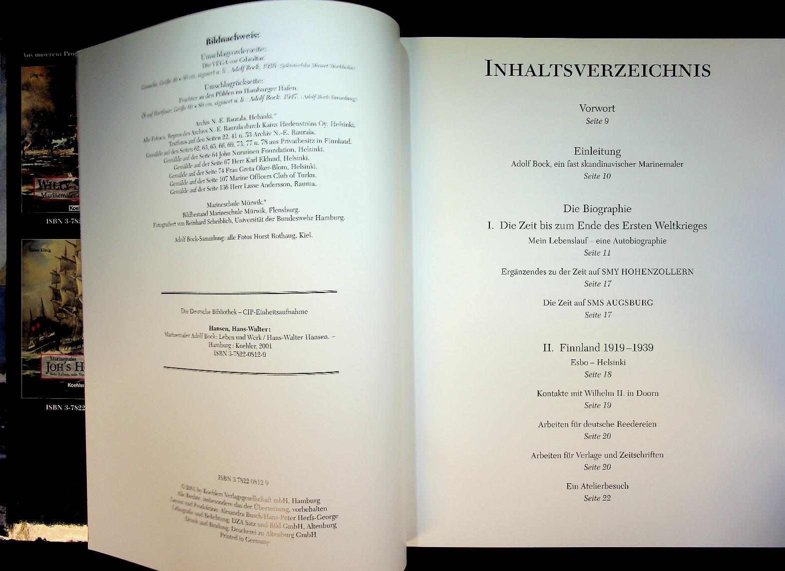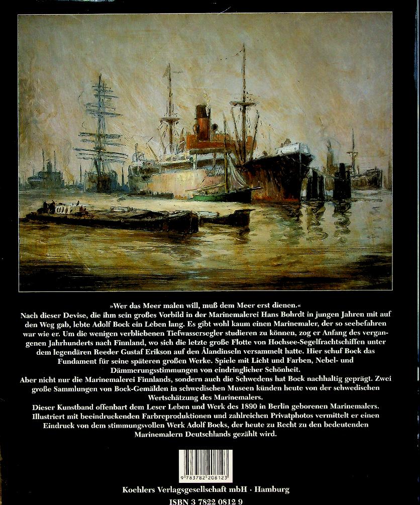 Hansen, Hans-Walter: 2001 Koehler Hamburg, hardcover with dust jacket, 1658 pages, illustrated. Marinemaler Adolf Bock. Leben und Werk by Hans Walter Hansen is a comprehensive monograph on German marine painter Adolf Bock, combining a biographical overview with an extensive, richly illustrated presentation of his seascapes, naval scenes and maritime commissions from Germany, Finland and Sweden. The book serves as an important reference for collectors, museums and maritime art enthusiasts, documenting Bock’s development from imperial and interwar marine painter to his later work for Scandinavian institutions. ISBN 9783782208123 In very good condition. German Language