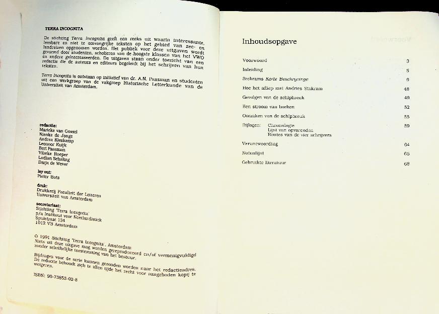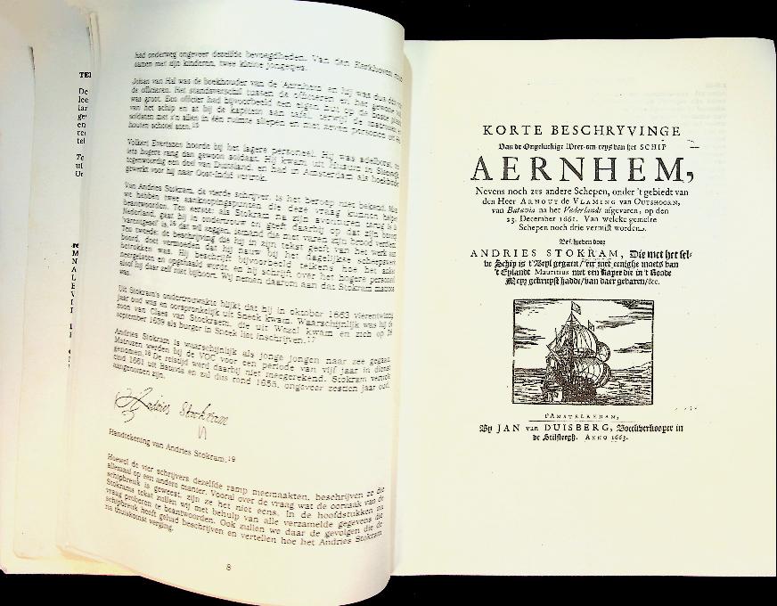 Stokram, Andries: 1991 Terra Incognita Amsterdam, softcover 72 blz., met illustraties. Korte beschryvinge van de ongeluckige weer-om-reys van het schip Aernhem is een 17de-eeuws ooggetuigenverslag van Andries Stokram over de terugreis van een VOC-konvooi in 1661–1662, waarin de Aernhem bij Mauritius verging en circa honderd overlevenden maandenlang op het destijds verlaten eiland strandden voordat zij door passerende schepen werden opgepikt. Het werk geldt als een levendig en zeldzaam VOC-reisverhaal dat niet alleen de schipbreuk en het verblijf op Mauritius beschrijft, maar ook context biedt over het konvooi onder Arnoudt de Vlamingh en de latere uitgaven en edities die dit relaas toegankelijk maakten. ISBN 9789073853027 Kleine sporen van gebruik. Goede staat