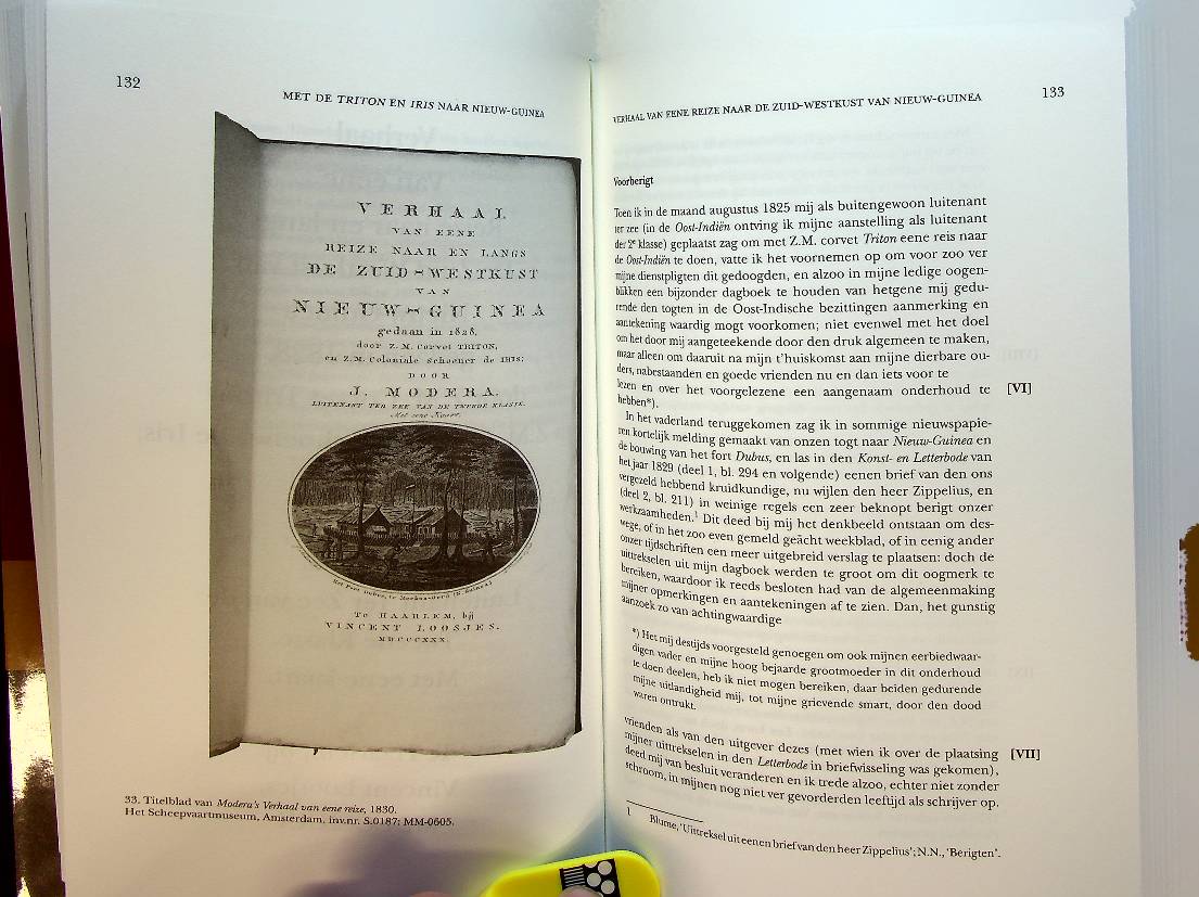Morzer-Bruyns, W.F.J.: 2018 Walburg Pers Zutphen, hardcover met papieromslag 383 blz., geïllustreerd. De uitgeschreven journaals van Justin Modera en Arnoldus Johannes van Delden over de expeditie van Z.M. korvet Triton en Z.M. koloniale schoener Iris, die in 1828 vanuit Ambon naar de noordwestkust van Nieuw-Guinea voeren om het gebied formeel voor Nederland in bezit te nemen en er een militaire post te stichten. Het boek plaatst deze reis in zijn historische en koloniale context en biedt daarmee een gedetailleerde inkijk in navigatie, dagelijks scheepsleven en de vroege Nederlandse expansie in Nieuw-Guinea. ISBN 9789462493087 In zeer goede staat