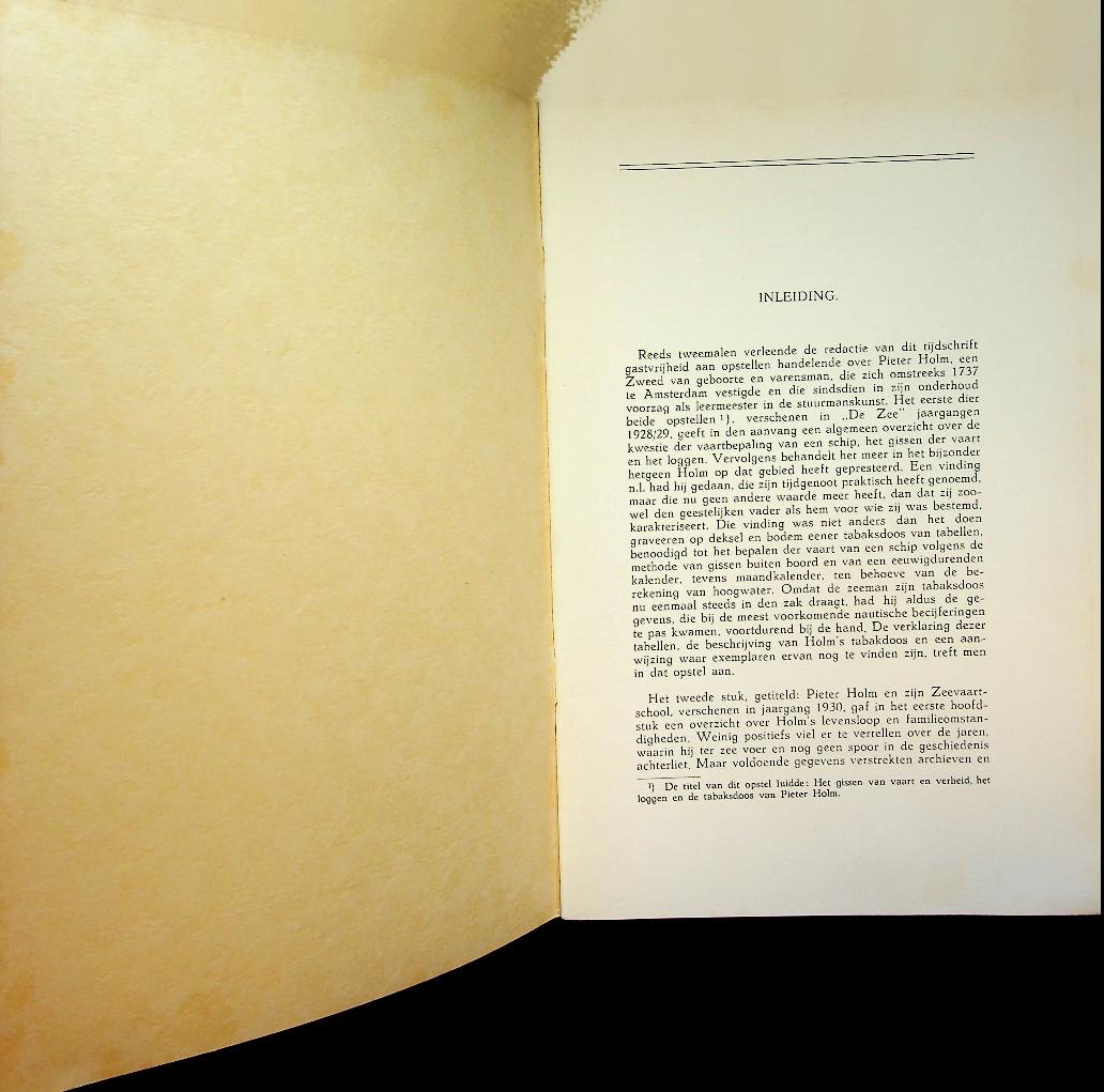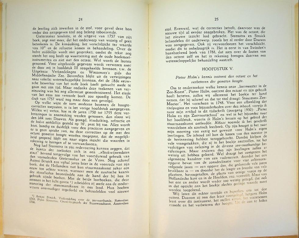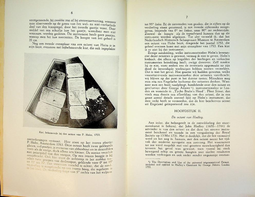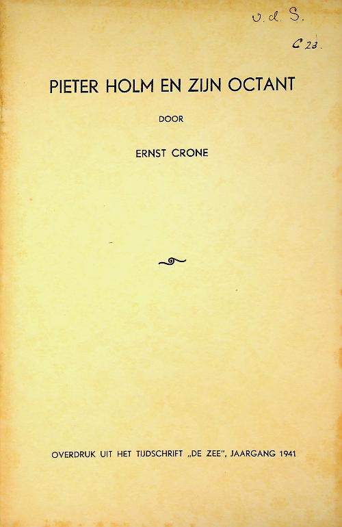Crone, E: 1941, softcover, 37 blz., geïllustreerd. Pieter Holm en zijn Octant is een uitvoerige studie van Ernst Crone uit 1941 over de rol van de Amsterdamse zeevaartschoolhouder Pieter Holm bij de vroege verspreiding en toelichting van de octant in de Republiek in de achttiende eeuw. Crone beschrijft zowel de technische werking en voordelen van het instrument als de manier waarop Holm het via onderwijs en handel onder zeelieden bekendmaakte, waarmee de nauwkeurigheid van navigatie op zee aanzienlijk werd verbeterd. In zeer goede staat