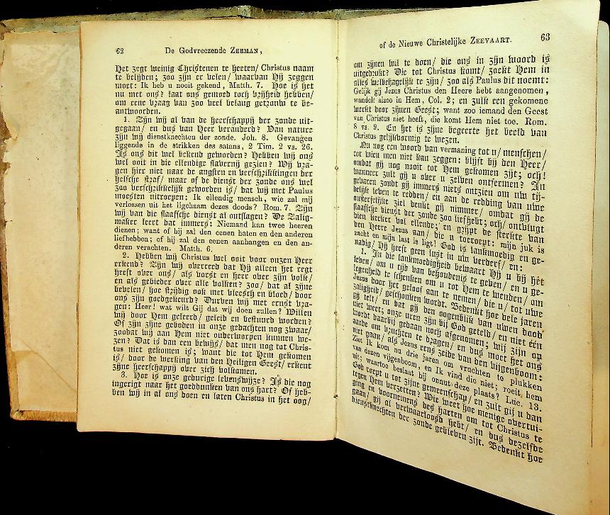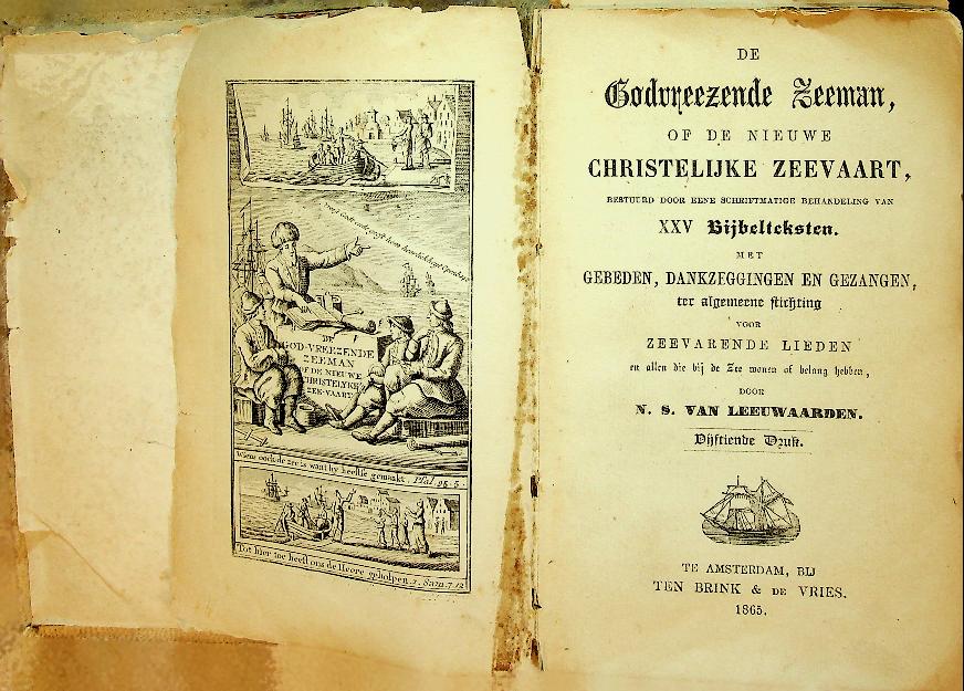 Leeuwaarden, N.S. van: 1865 Ten Brink & de Vries Amsterdam, hardcover perkament, 528 blz. De Godvreezende zeeman, of De nieuwe christelijke zeevaart, is een streng-calvinistisch stichtelijk boek dat in zesentwintig bijbelteksten, gebeden en gezangen de zeeman oproept tot berouw, godsvrucht en nauwgezet plichtsbesef in zijn gevaarlijke beroep. Het presenteert de zeevaart als door God zelf verordineerd, waarschuwt tegen zonde, vloeken en bijgeloof, en biedt een vast stramien voor dagelijkse en zondagse godsdienstoefening aan boord, vooral bedoeld voor kleinere schepen zonder eigen predikant. Omslag ligt bijna los van boekblok, die zelf in redelijke staat is. Boek heeft aandacht nodig van een boekbinder.