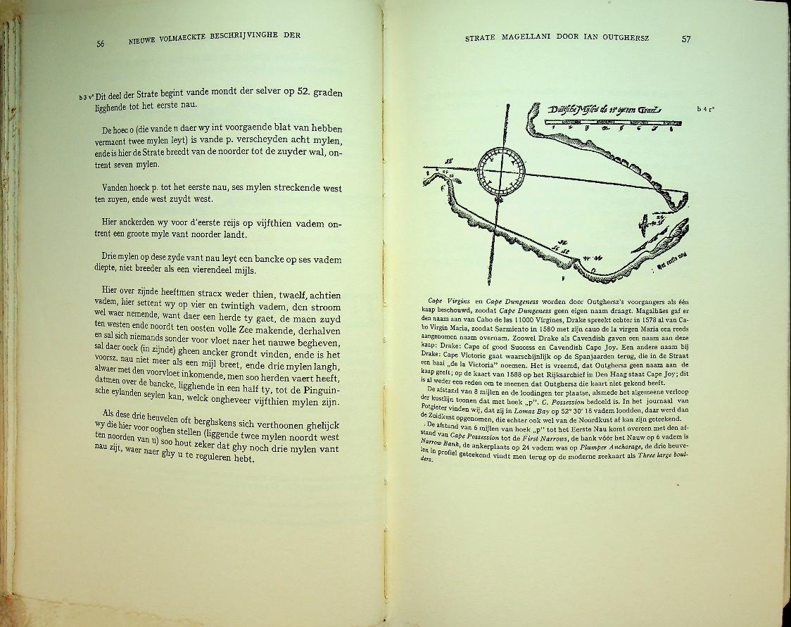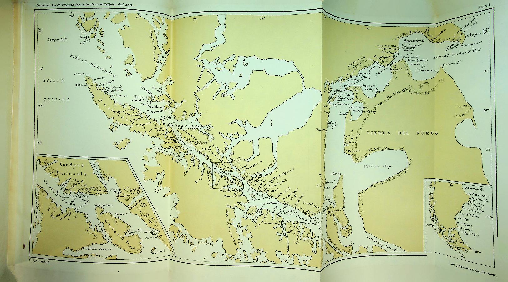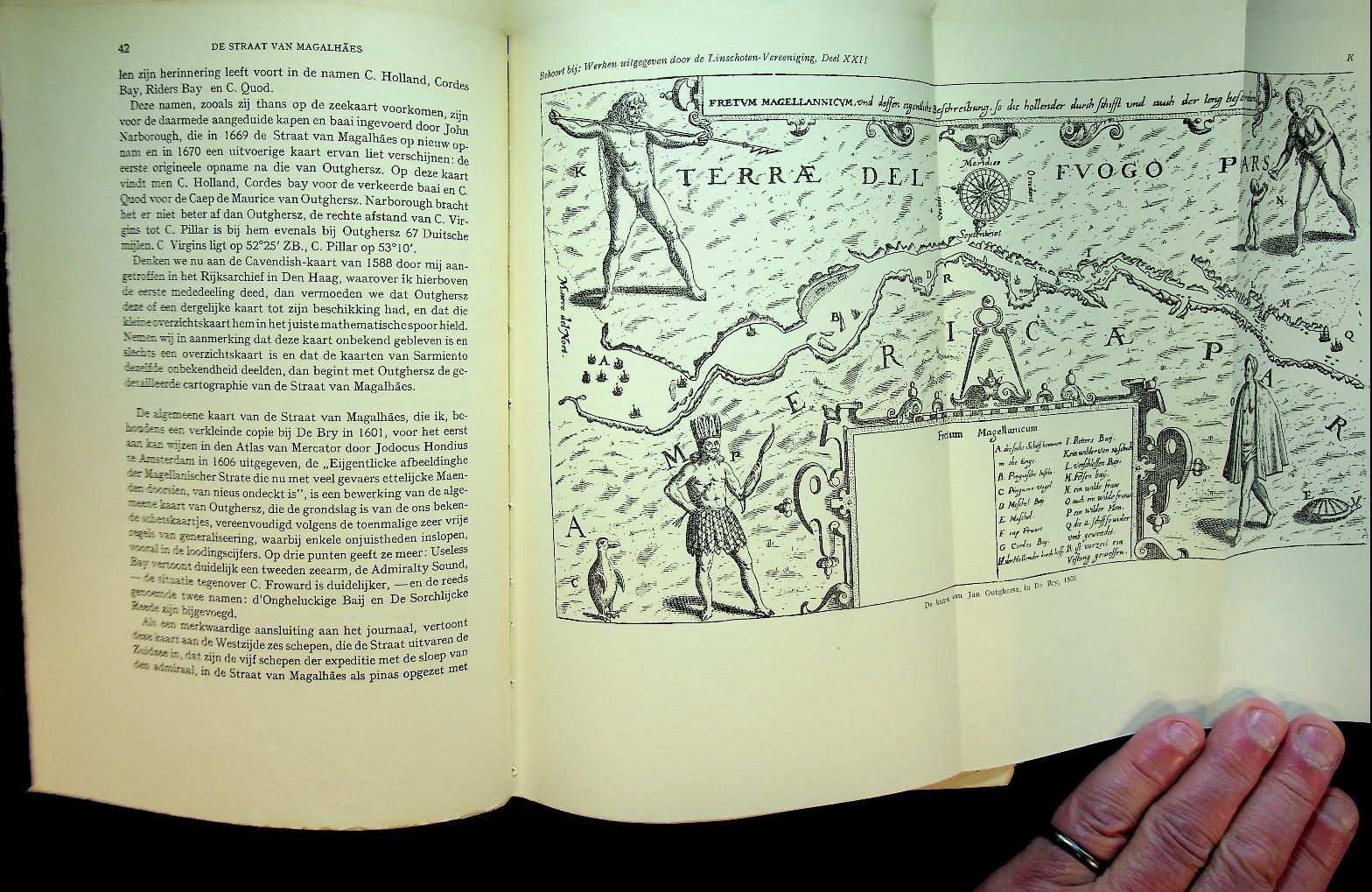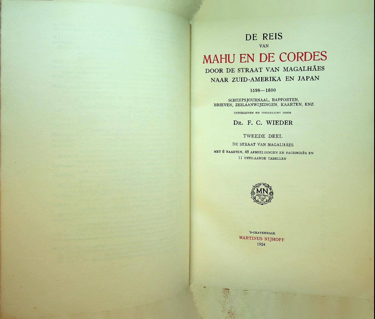 Wieder, F.C.: 1924 Nijhoff, 's-Gravenhage, hardcover, 117 blz., met vele platen en uitvouwbare kaarten. Het boek "De Reis van Mahu en de Cordes door de Straat van Magalhaes naar Zuid-Amerika en Japan, 1598-1600" (deel 21 en 22 van de Linschoten Vereeniging, uitgegeven door F.C. Wieder in 1923) beschrijft de rampzalige expeditie van vijf Rotterdamse schepen onder admiraal Jacques Mahu en later Simon de Cordes. Het werk bevat scheepsjournalen, rapporten, brieven en kaarten van deze pioniersreis, waarbij slechts één van de vijf schepen (het Geloof onder kapitein Sebald de Weert) terugkeerde naar Nederland, terwijl de bemanning grotendeels omkwam door scheurbuik, aanvallen en barre omstandigheden in de Straat van Magellaan en langs de Zuid-Amerikaanse kust. In zeer goede staat.