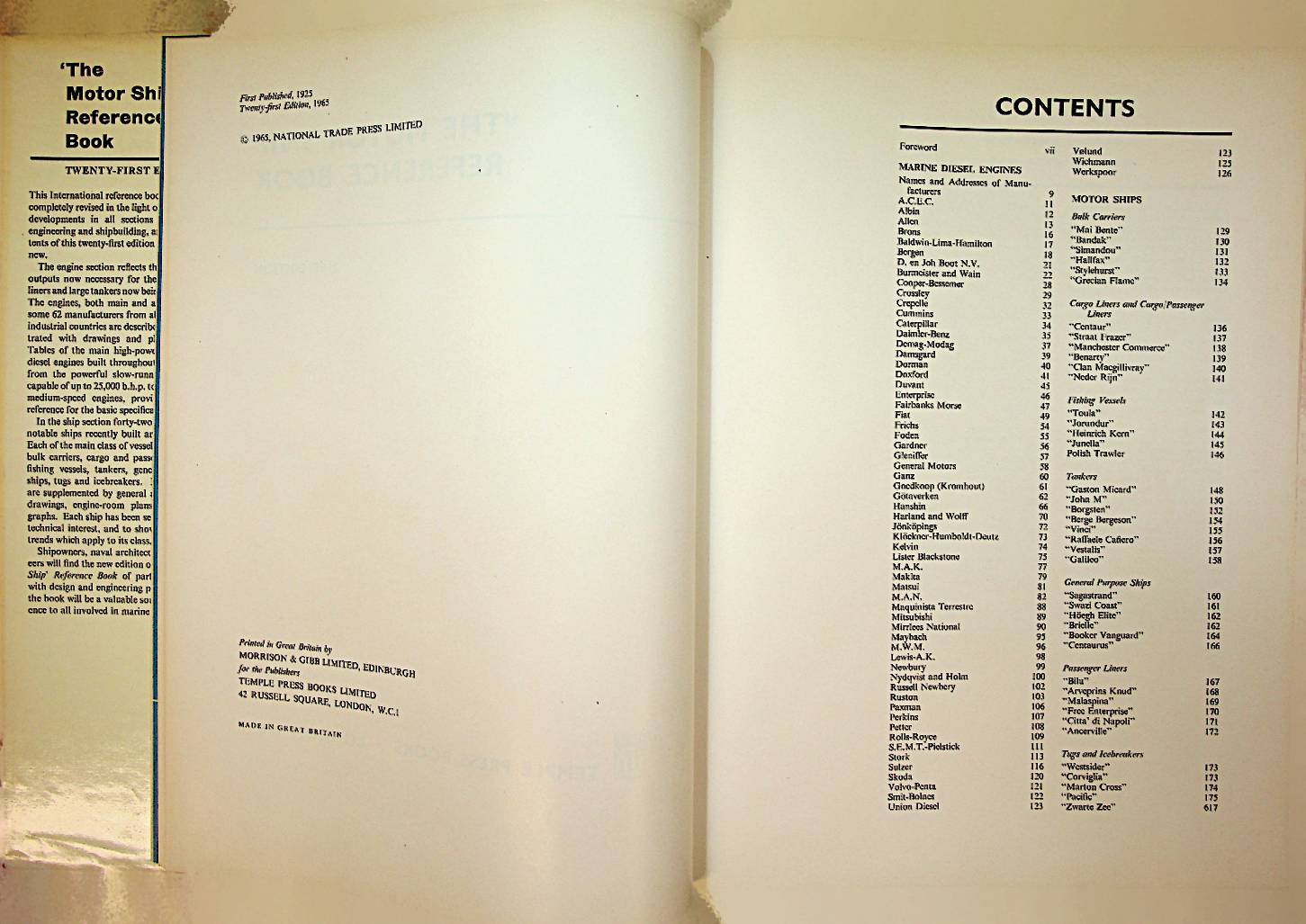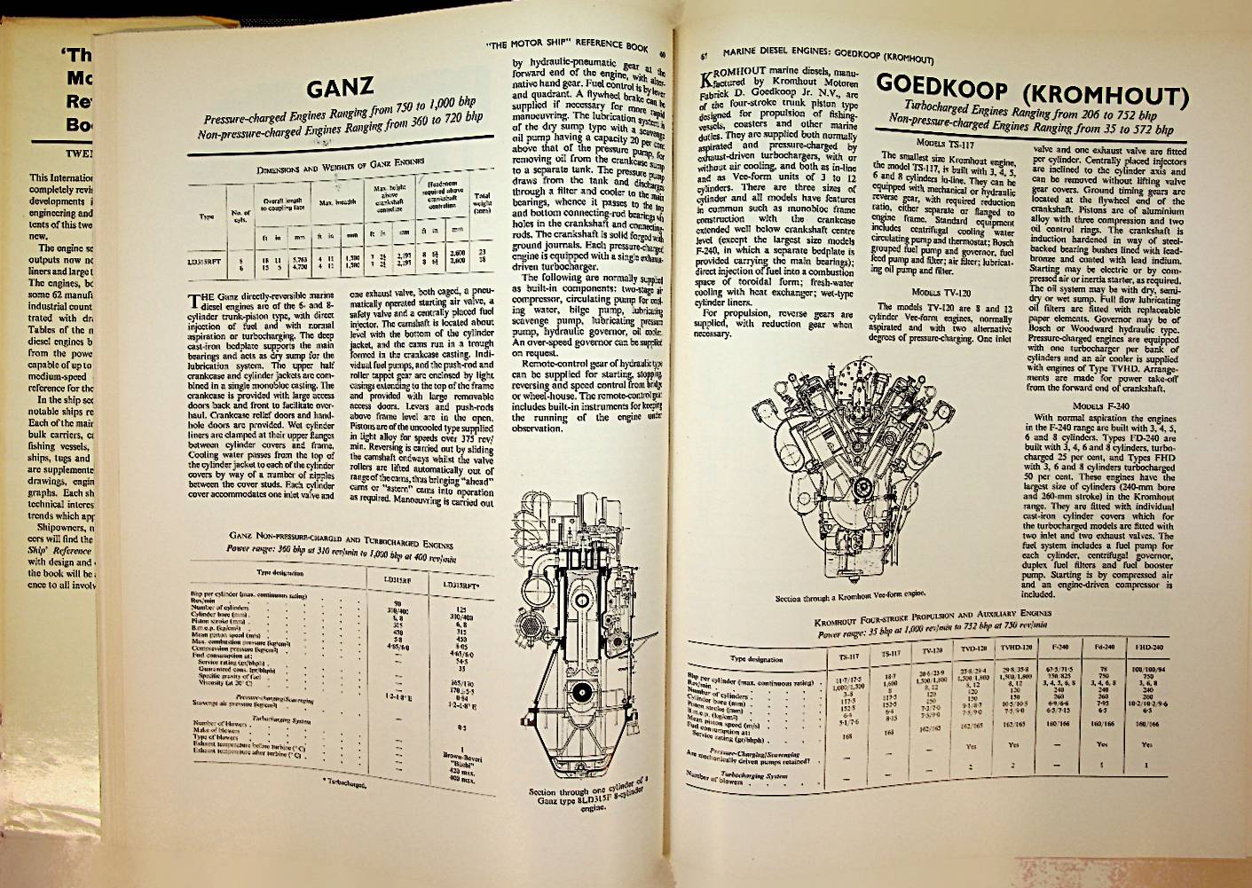 Diverse authors: 1965 London. Hardcover, 176 pages.The Ship Engines used for the Merchant Shipping in 1965. With photos and illustrations. Also the ships in detail who are ere prepared for the future. The Motorship Reference Book (21st edition) is a technical handbook for marine engineers and naval architects, covering diesel propulsion, auxiliary machinery, shipboard systems, performance data and design/operational parameters for motorships. It compiles standardized tables, formulae, engine and equipment specifications, and practical guidance intended as a day‑to‑day reference on board and in the design office. (no dust jacket as on image) In good condition