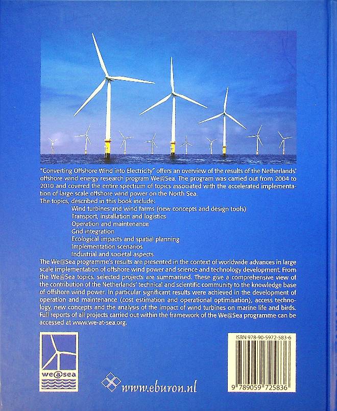 Beurskens, J: 2011 Eburon, Delft, hardcover 160pages, illustrated. “Converting Offshore Wind into Electricity” presents the main results of the Dutch We@Sea research program, showing how the Netherlands has contributed to knowledge on the design, operation, and integration of offshore wind farms into the electricity system. The book discusses technical, economic, and environmental aspects of offshore wind energy, aiming to reduce costs and risks while enabling large‑scale, reliable power production from wind at sea. ISBN 9789059725836 In very good condition