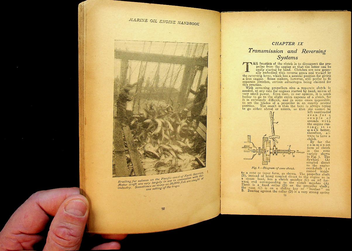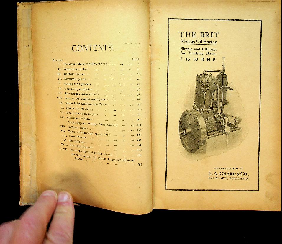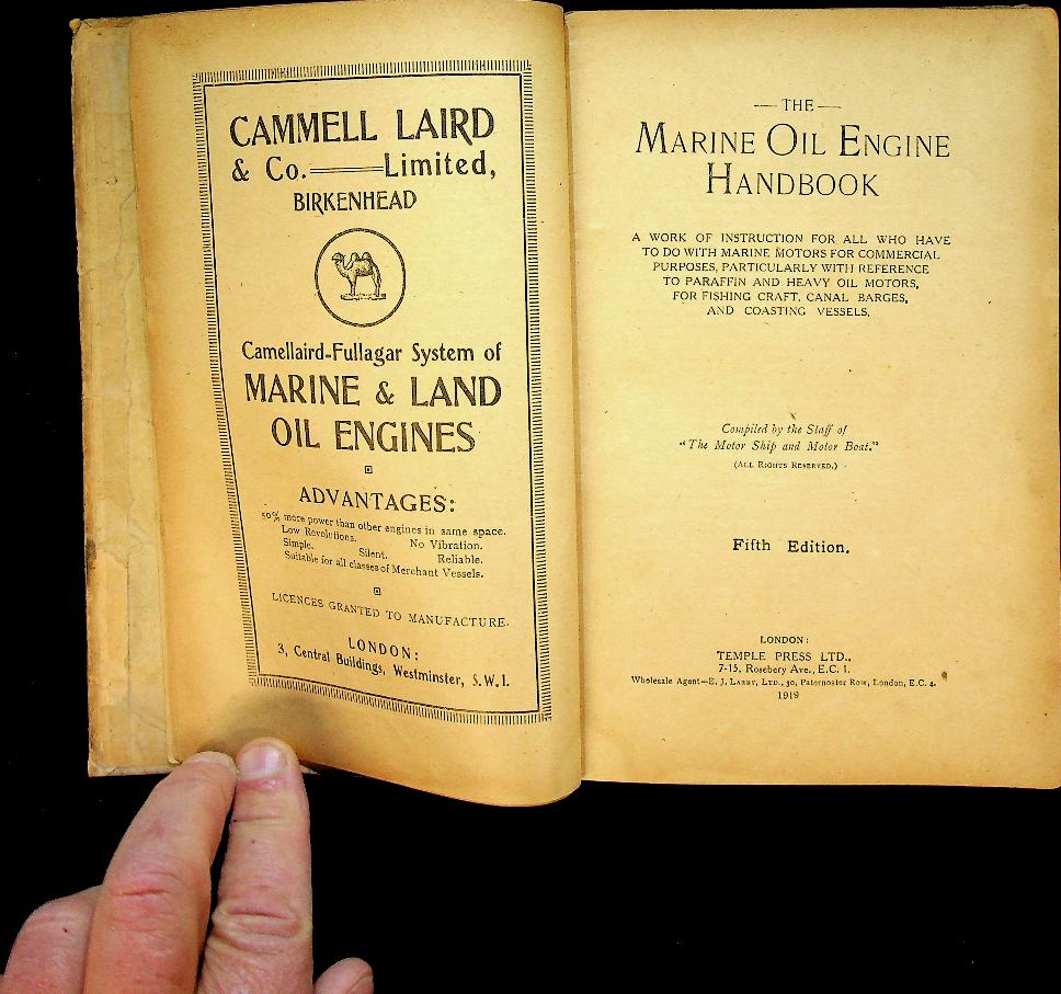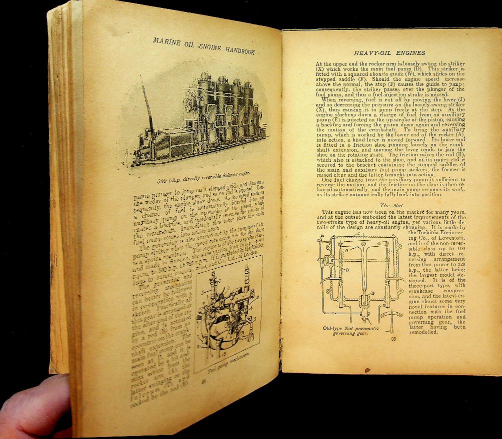 Collective: 1919 London, Fifth edition, hardcover, 194 pages, illustrated with photos and technical drawings. practical guide for engineers and operators working with marine oil engines, focusing on the operation, maintenance, and technical aspects of paraffin and heavy oil motors used in commercial shipping at the time. It provides detailed instructions and insights into the design, fuel systems, and best practices for ensuring efficient and reliable performance of these early marine engines. In good condition
