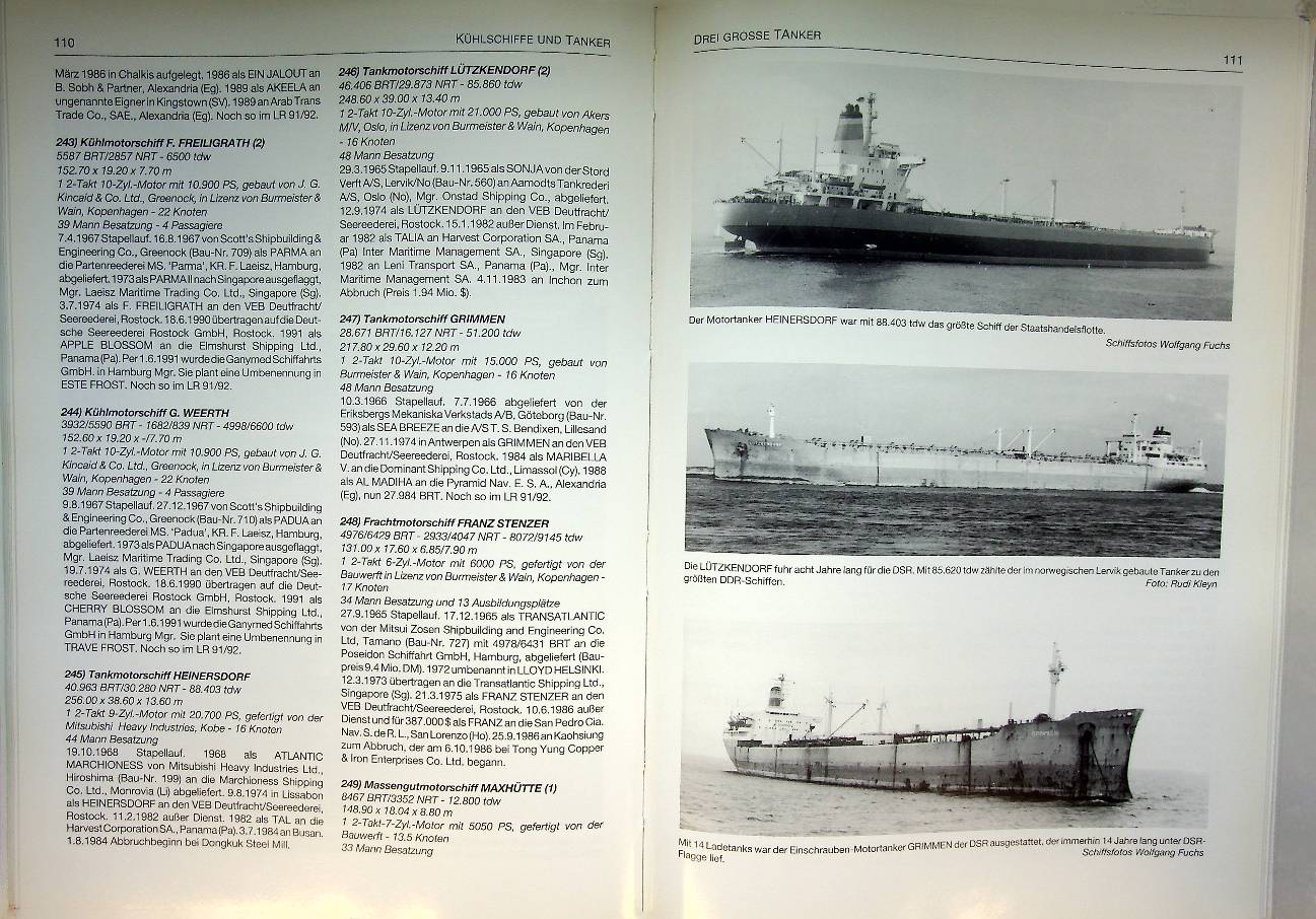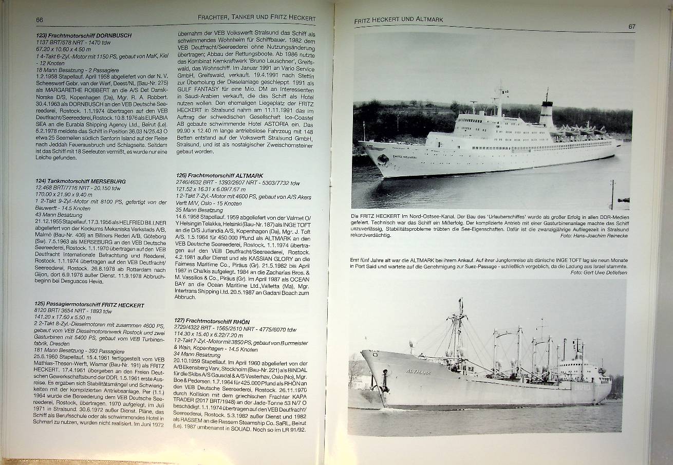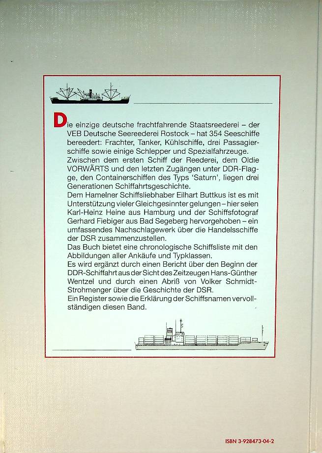 Buttkus, E: 1992 Bad Segeberg, hardcover 176 pages. All the 354 ships, with photographs, specifications and history. The book gives substantial attention to the company’s fleet, showing how Deutsche Seereederei grew from a handful of early steamers like Rostock, Wismar and Stralsund into one of Europe’s largest universal shipping companies with over 200 vessels at its peak in the late 1970s. It highlights the technical development and variety of ship types in the fleet, including small coasters, tankers and large general cargo ships of the “Frieden” series, of which the motor ship Dresden survives today as the museum ship Frieden in Rostock ISBN 9783928473040 / 3928473042 In very good condition