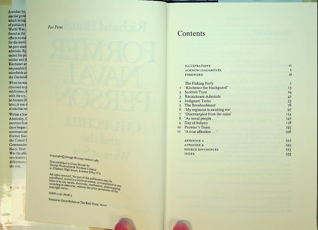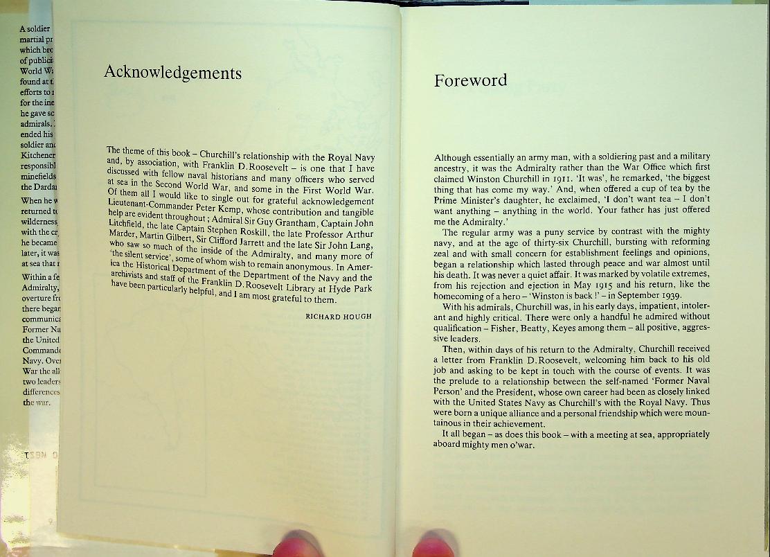 Hough, R: 1985 London, hardcover with dustjacket 244 pages, with photos. Richard Hough examines Winston Churchill’s turbulent but decisive relationship with the Royal Navy, from his controversial First World War leadership to his dominant role in directing British maritime strategy in the Second World War. The book portrays Churchill as a dynamic yet often impulsive statesman whose strategic vision at sea helped secure ultimate victory but frequently strained relations with professional naval commanders. ISBN 9780297787068 / 0297787063 In very good condition
