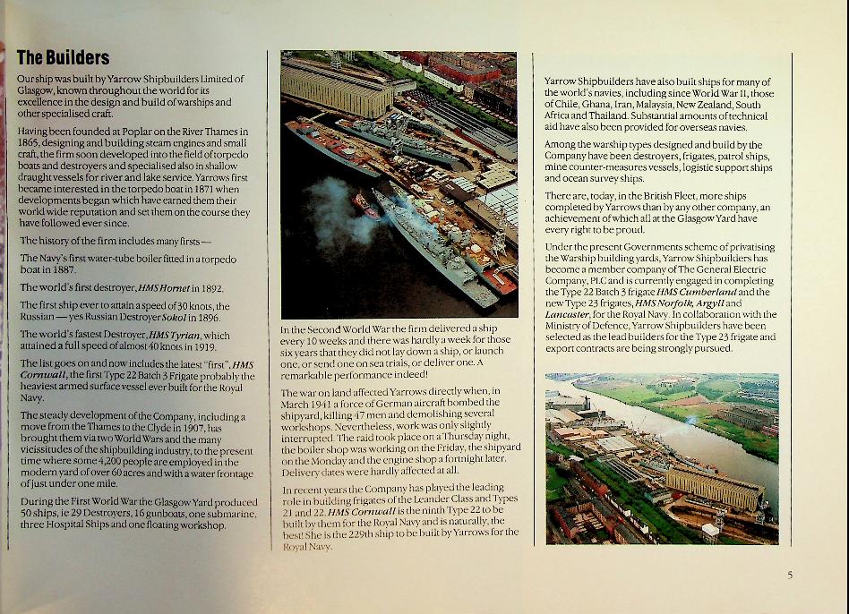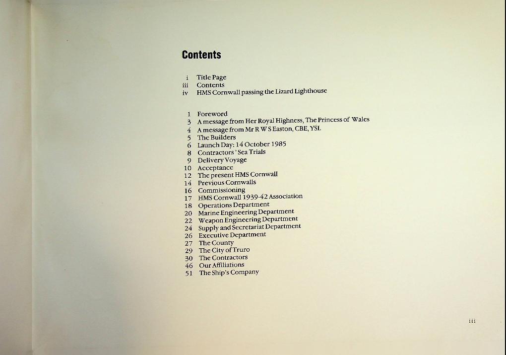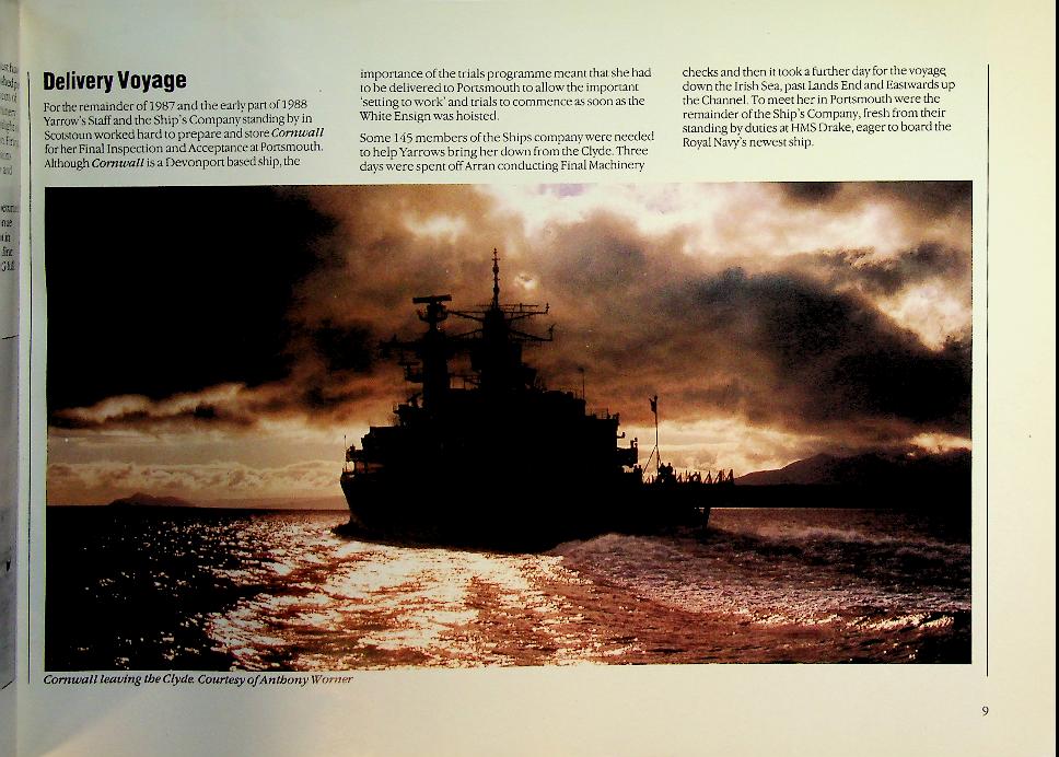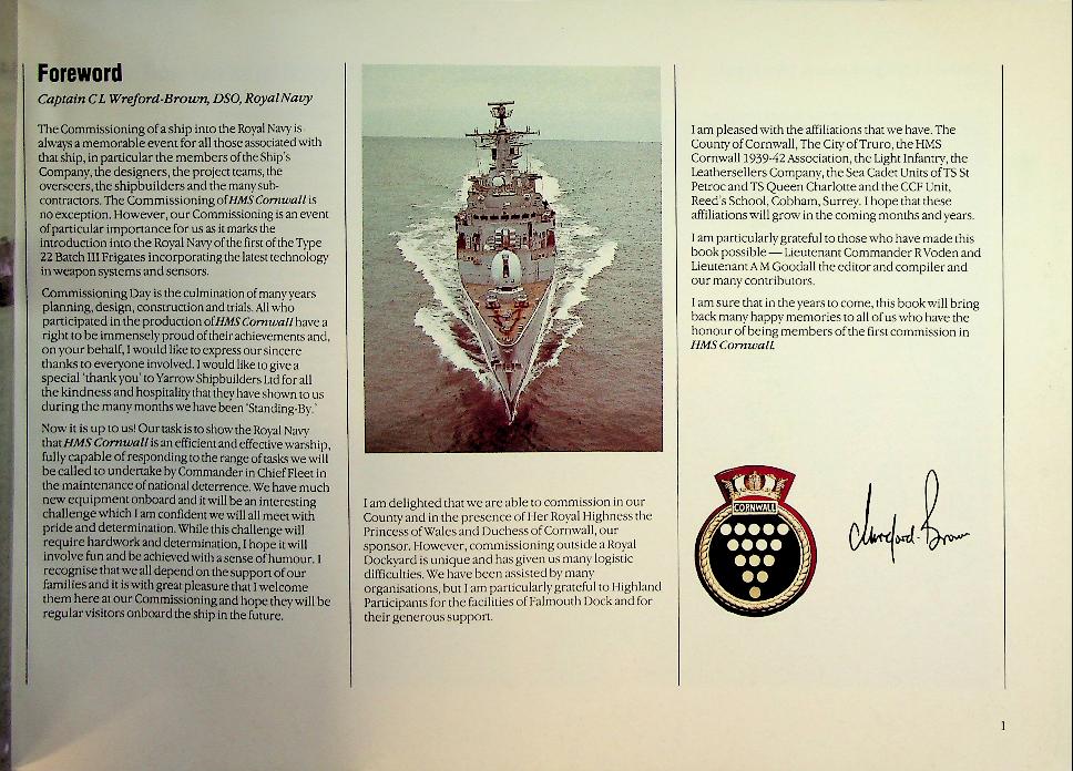 Voden, R. and A. Goodall: 1988 UK, softcover 54 pages. A volume published to commemorate the commissioning of HMS Cornwall in the presence of Her Royal Highness, The Princess of Wales at Falmouth. Colour and black and white illustrations. Frigate type 22, fair condition.