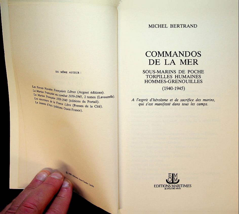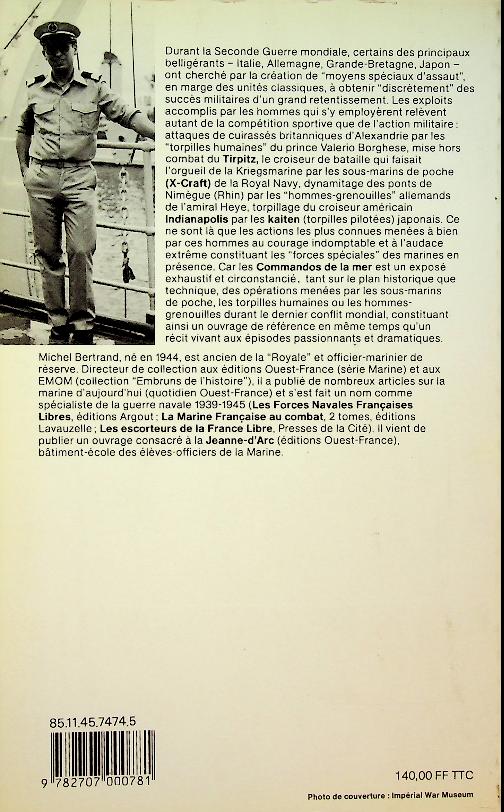 Bertrand, Michel: 1985 Editions Maritimes, softcover, 427 pages, illustrated. Commandos de la Mer is a French‑language, photo‑rich history of naval special operations by Michel Bertrand, focusing on midget submarines, human torpedoes and frogmen between 1914 and 1945. It describes the development, missions and tactics of these “sea commandos” in both World Wars, with many operational anecdotes and illustrations that make it accessible to readers interested in early underwater warfare and special forces at sea. ISBN 9782707000781 In very good condition. French language