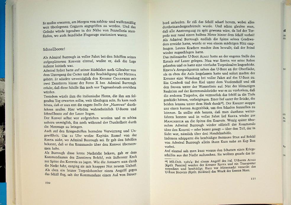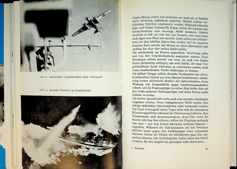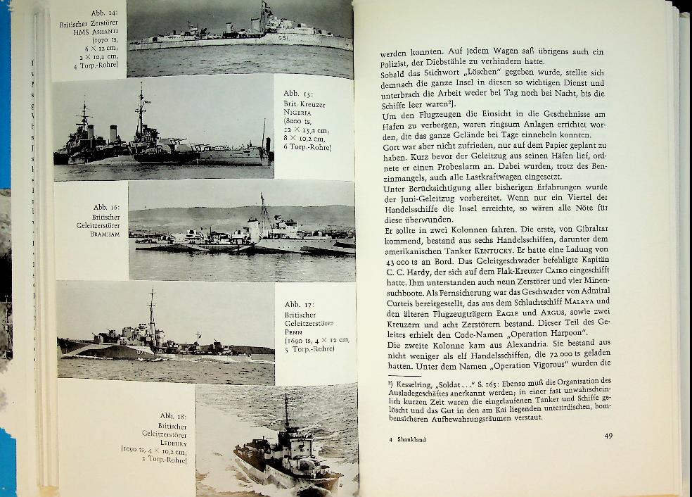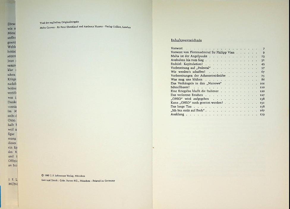Shankland, P. and A. Hunter: 1963 Munchen, hardcover with dustjacket 180 pages, with photos. Factual account of the audacious 1942 Allied convoy operation through the Mediterranean to relieve the besieged island of Malta during the Second World War, highlighting the tactical challenges and heavy losses at sea. The authors Peter Shankland and Anthony Hunter reconstruct the planning, execution, and human drama of this convoy battle, portraying it as one of the most daring naval undertakings of the war. In good condition. German language