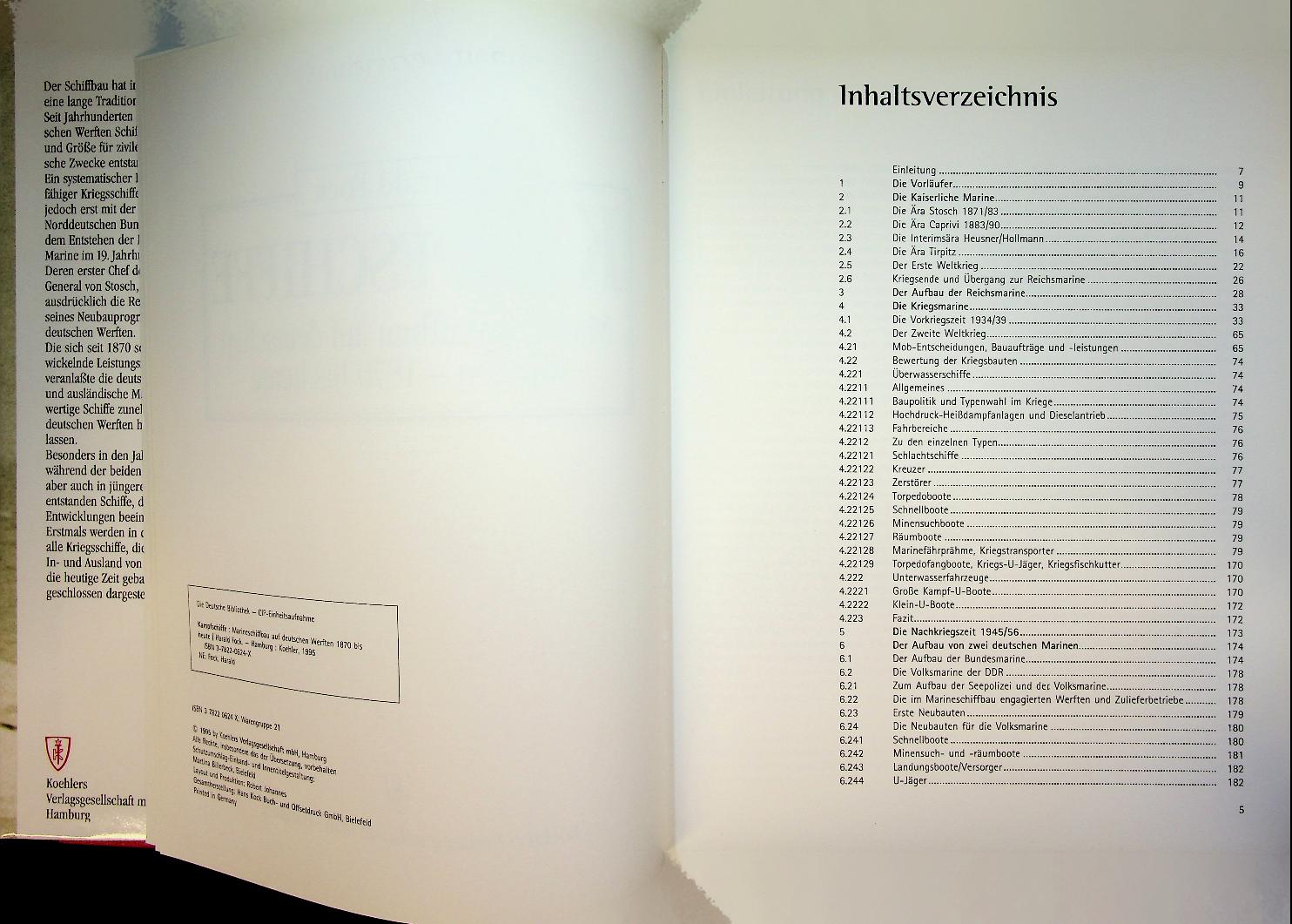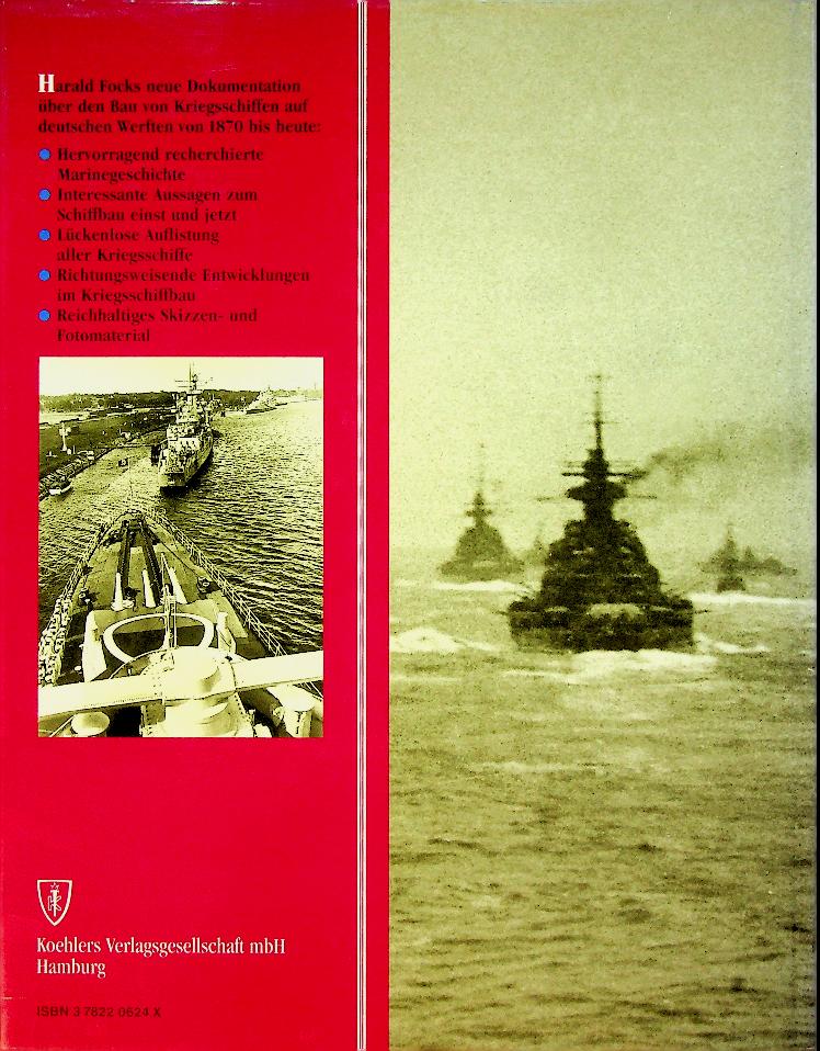Fock, Harald: 1995 Koehler Hamburg, hardcover with dust jacket, 193 pages, illustrated. Kampfschiffe. Marineschiffbau auf deutschen Werften 1870 bis heute gives an illustrated overview of the construction and development of major German warships from the Imperial Navy through Reichsmarine, Kriegsmarine and Bundesmarine. The book combines photographs, drawings and brief service notes to present the main types and classes built on German yards from 1870 to the late twentieth century. ISBN 9783782206242 In very good condition