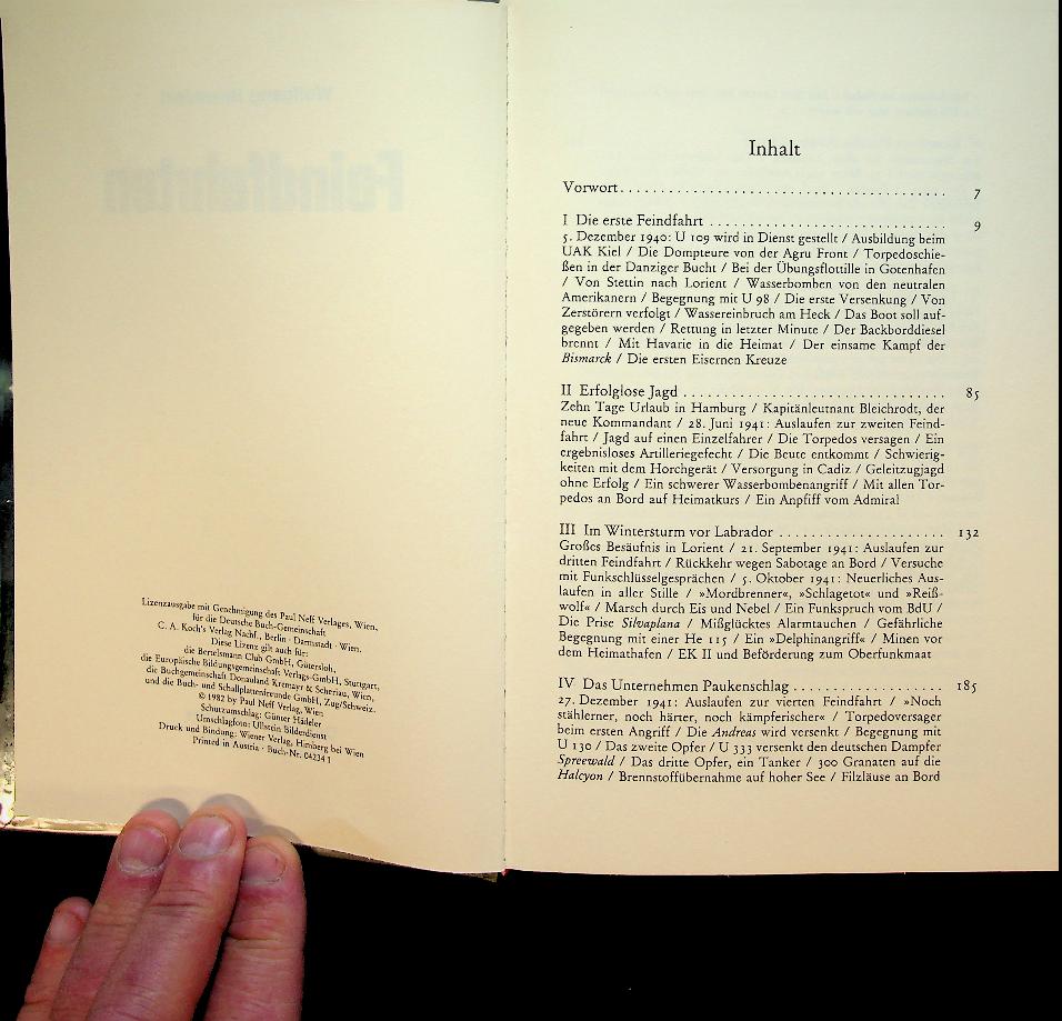 Hirschfeld, W: 1982 Wien, hardcover with dust jacket, 384 pages, illustrated. Feindfahrten is the wartime diary of U-boat radio operator Wolfgang Hirschfeld, describing in vivid detail his patrols on U 109 and later U 234 between 1940 and 1946, including operations in the North Atlantic and the final mission to Japan with advanced German technology. It offers a personal, matter‑of‑fact perspective on daily life, danger, and comradeship aboard German submarines, making it a key eyewitness account of the Battle of the Atlantic. ISBN 9783701401895 In very good condition. German language
