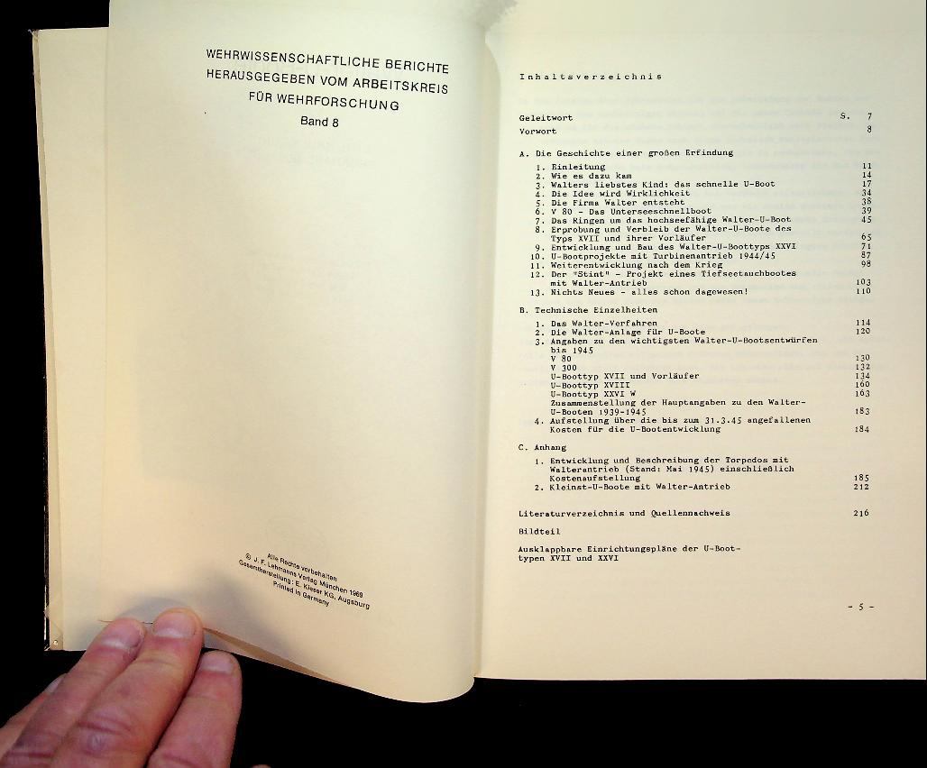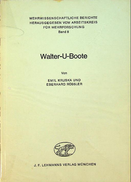Kruska, Emil und E. Rossler: 1969 Lehmann München, softcover, 216 pages + plus photo plates. Walter-U-Boote by Emil Kruska and Eberhard Rössler is a detailed technical and historical study of the German experimental “Walter” submarines, explaining their hydrogen-peroxide propulsion, design evolution, and trials during the Second World War. The book combines extensive plans, sectional drawings, and photographs to document Types XVII and related projects, highlighting both their innovative performance and the practical problems that prevented large-scale operational deployment. In good condition