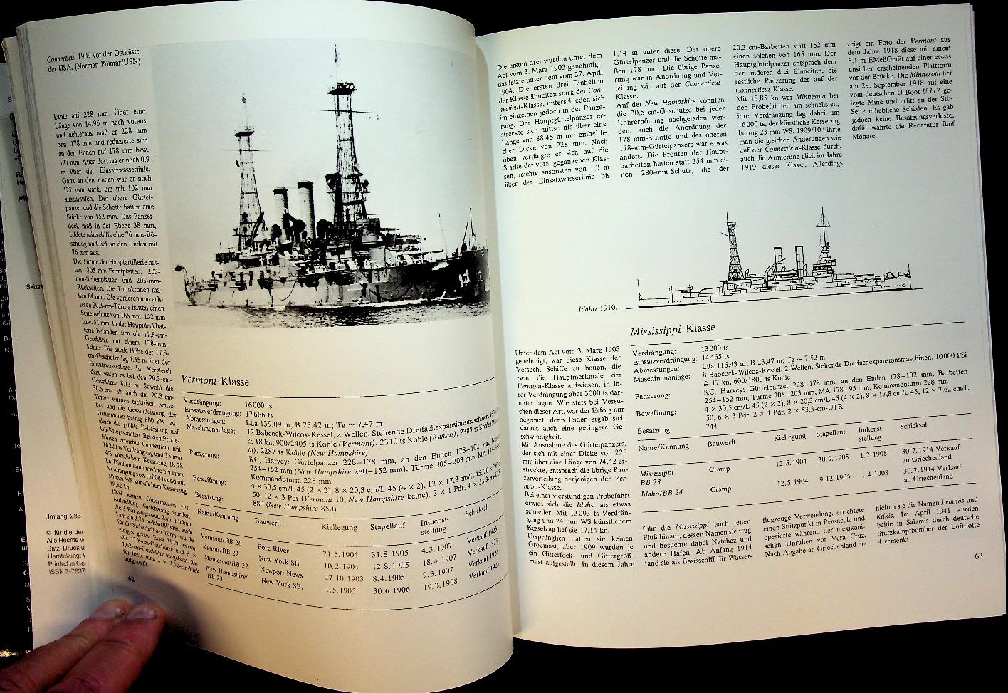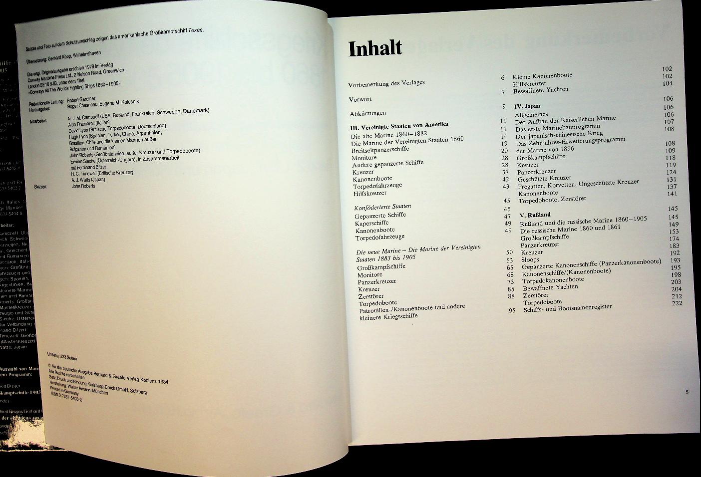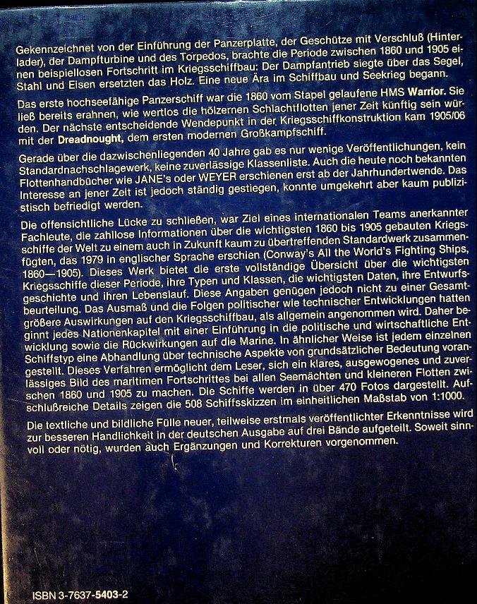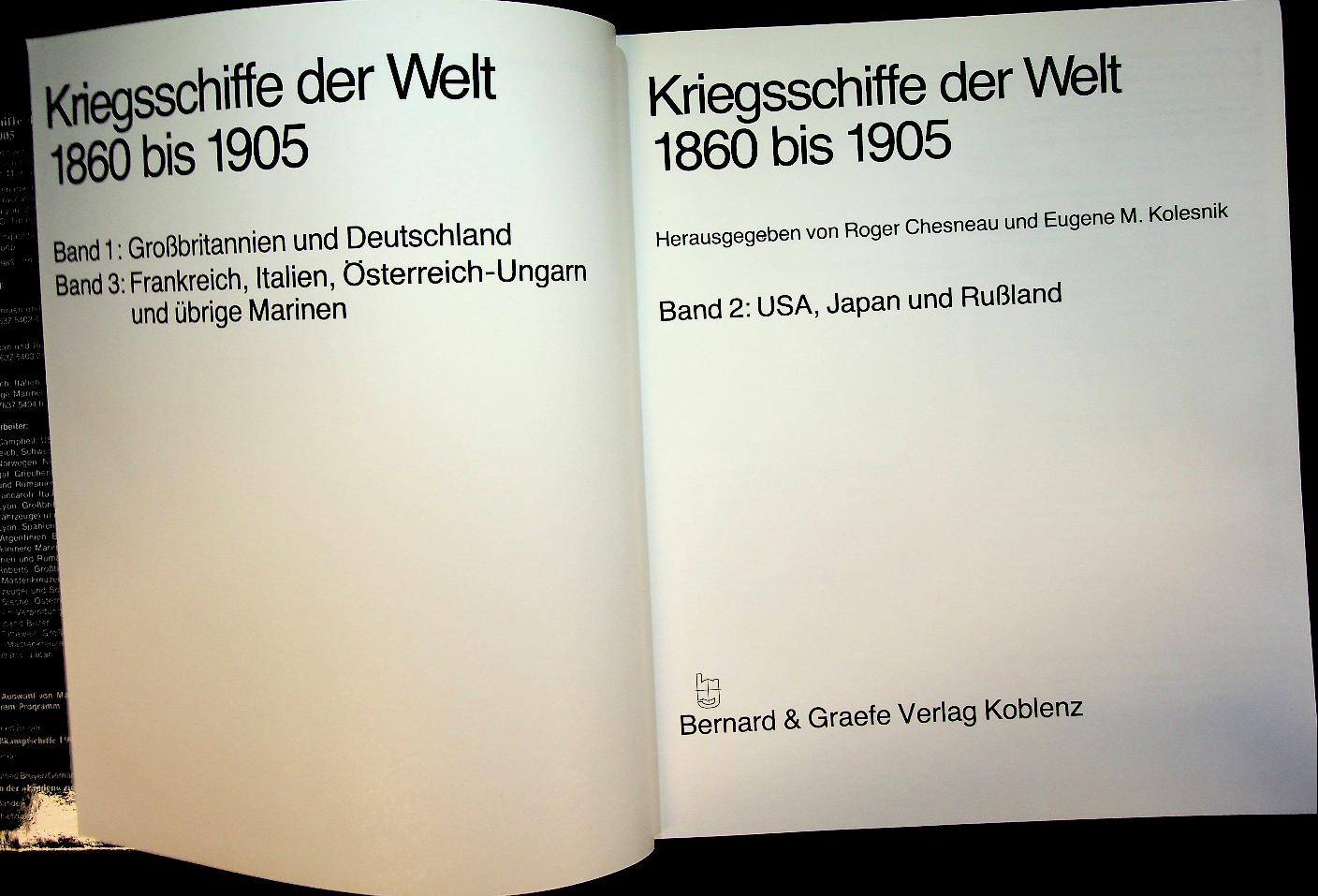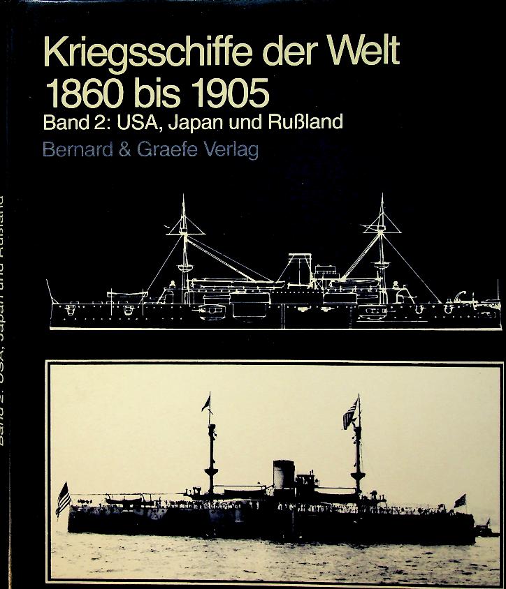 Chesneau, R. and E.M. Kolesnik: 1984 Bernard Graefe Verlag, hardcover with dust jacket, 233 pages, with photos and detailed side profiles. Kriegsschiffe der Welt 1860 bis 1905, Band 2 by Roger Chesneau covers major warships of the period 1860–1905, highlighting the transition to armoured steel fleets, classifications by type and navy, and their roles in specific conflicts and fleet formations. It provides concise entries for individual ships with key data on displacement, dimensions, armament, armour, propulsion and building yards, supported by illustrations and plan views ISBN 9783763754038 / 3763754032 In very good condition
