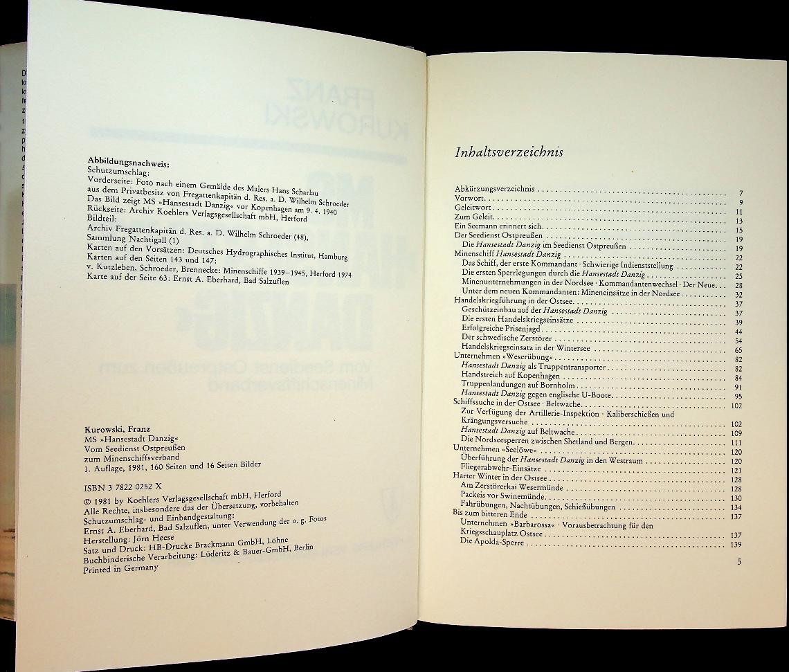 Kurowski, F: 1981 Koehler Verlag Germany, hardcover with dustjacket 175 pages, with photo's. The book describes the history of the German merchant ship MS Hansestadt Danzig, from her service with the “Seedienst Ostpreußen” to her wartime role as a minelayer in the Kriegsmarine and the experiences of her crew. ISBN 9783782202527 / 378220252x In very good condition