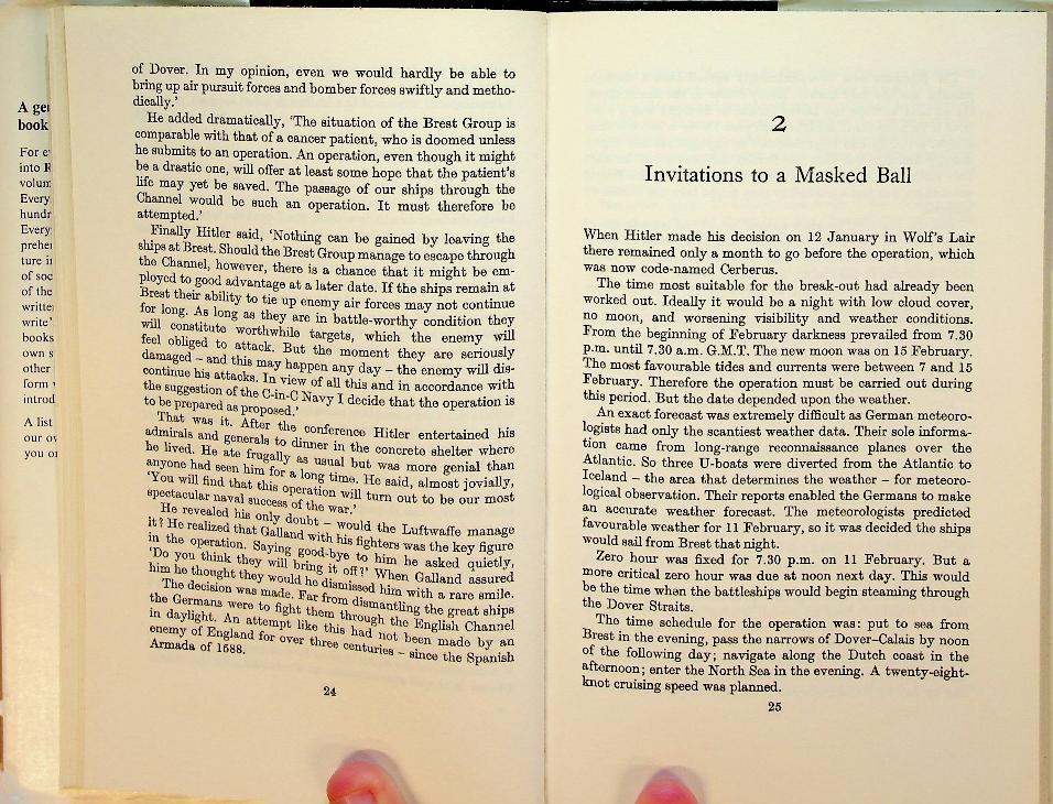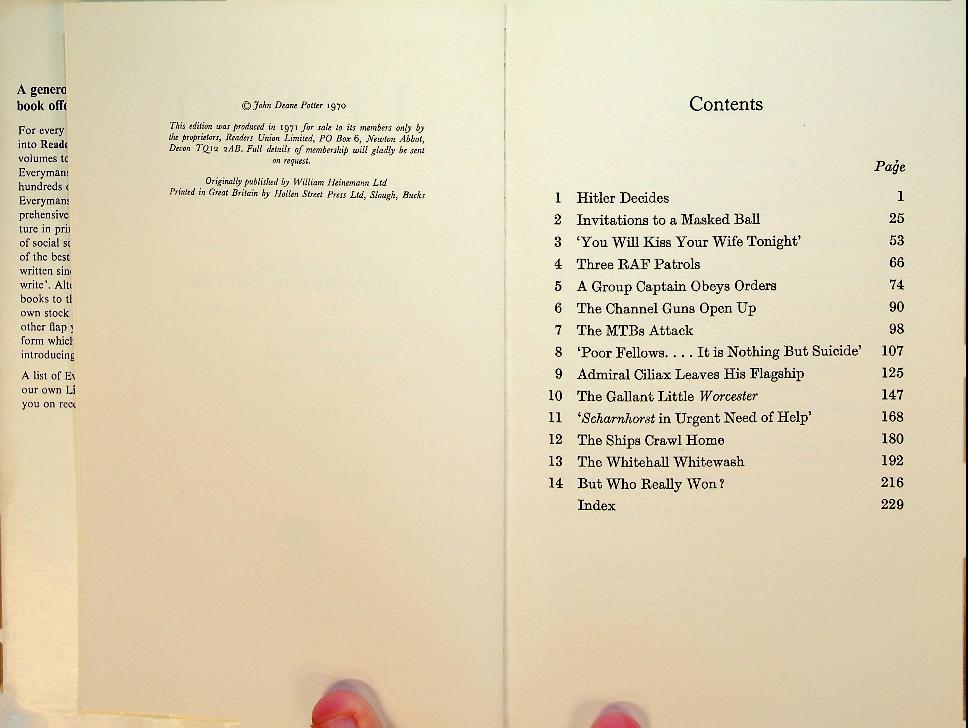 Potter, J.D.: 1970 UK, hardcover with dustjacket 235 pages, with photo's. The Break-out of the German Battleships Scharnhorst, Gneisenau, E Prinz Eugen. WW2. The book econstructs the dramatic 1942 dash of German battleships from Brest through the English Channel, detailing the planning, execution, and Allied failures that allowed the operation to succeed. Potter combines operational history with eyewitness material to highlight both the audacity of the German move and the organizational chaos on the British side. ISBN 9780330029100 In very good condition