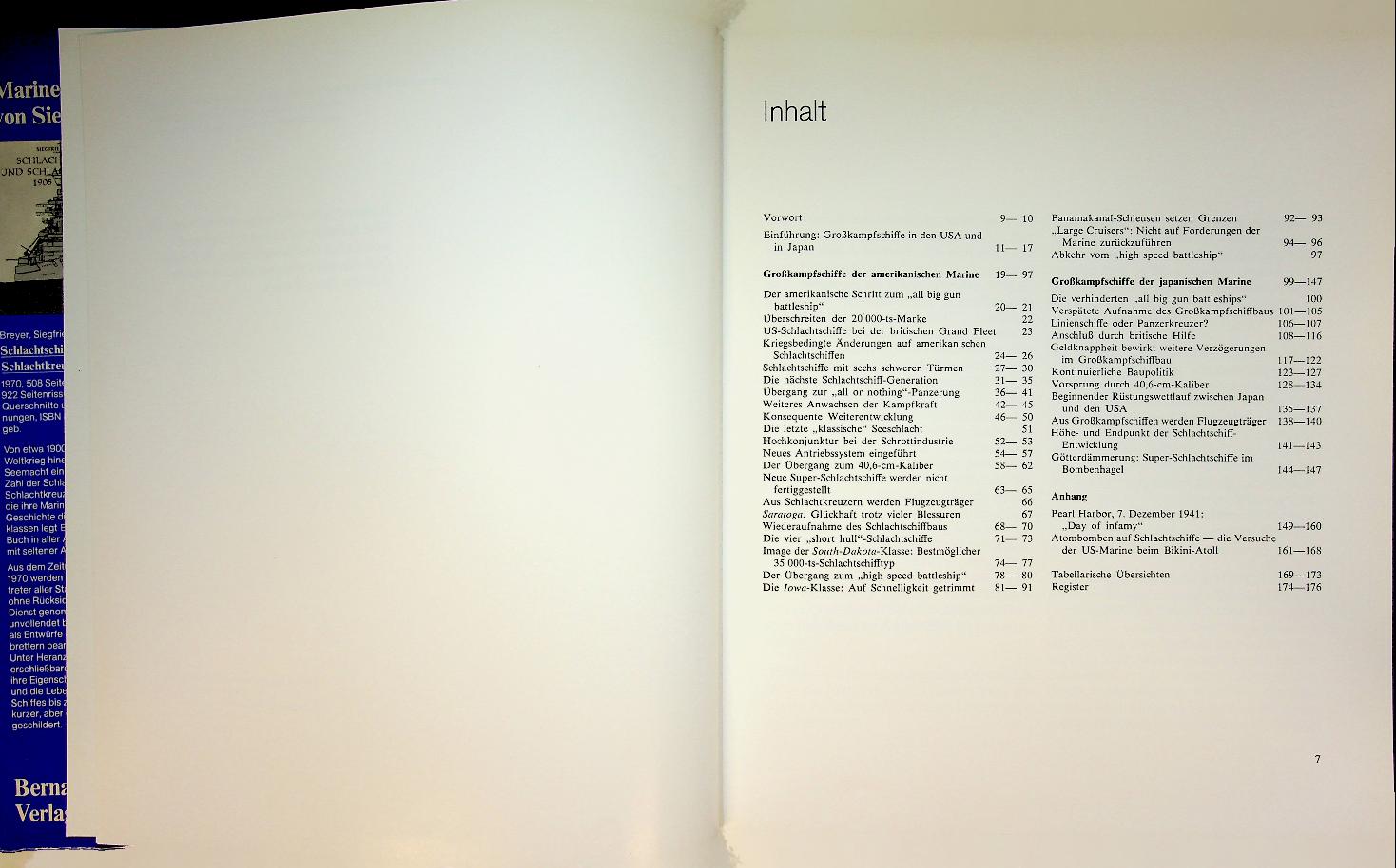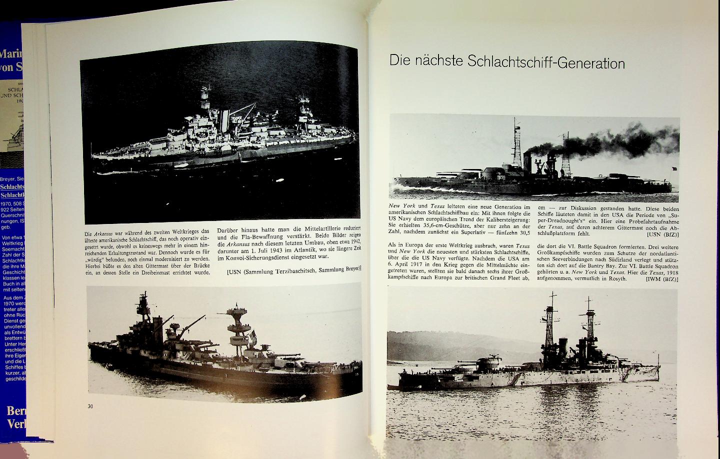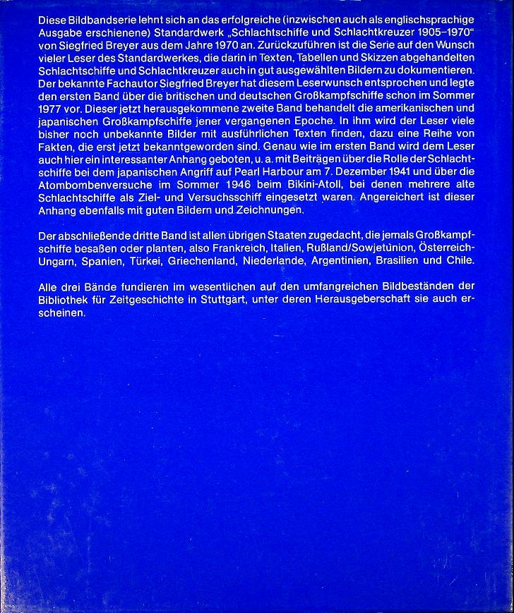 Breyer, S: 1978 Graefe Munchen, hardcover with dustjacket 175 pages, with many photos of the large fighting ships. This volume is an illustrated technical survey of the capital ships of the United States Navy and the Imperial Japanese Navy between 1905 and 1970, covering battleships, battlecruisers and related designs with detailed data, photographs and drawings. It documents the development, modernization and wartime service of these ships up to their postwar fates, placing them within the broader evolution of naval power in the 20th century. ISBN 9783763751754 / 3763751750 In very good condition