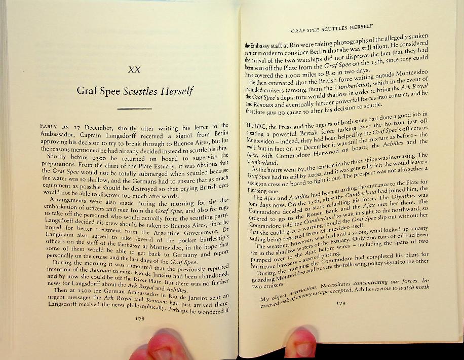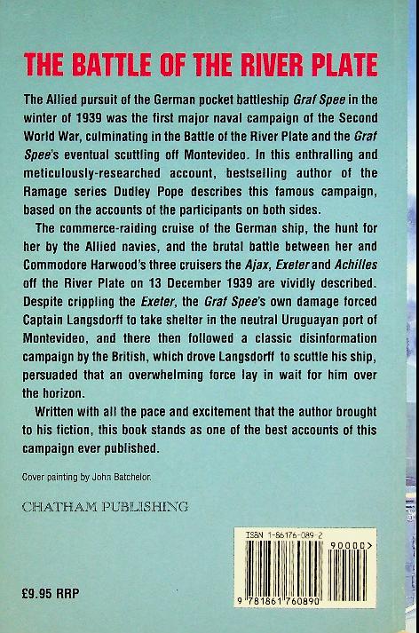 Pope, Dudley: 1999 London, paperback 219 pages, illustrated. narrative history of the 1939 hunt for the German pocket battleship Admiral Graf Spee, culminating in her clash with the cruisers Exeter, Ajax, and Achilles off the River Plate and subsequent scuttling off Montevideo. Pope focuses on the men, ships, and tactics on both sides, showing how this first major naval action of the Second World War helped shape Britain’s early war at sea. ISBN 9781861760890 / 1861760892 In very good condition