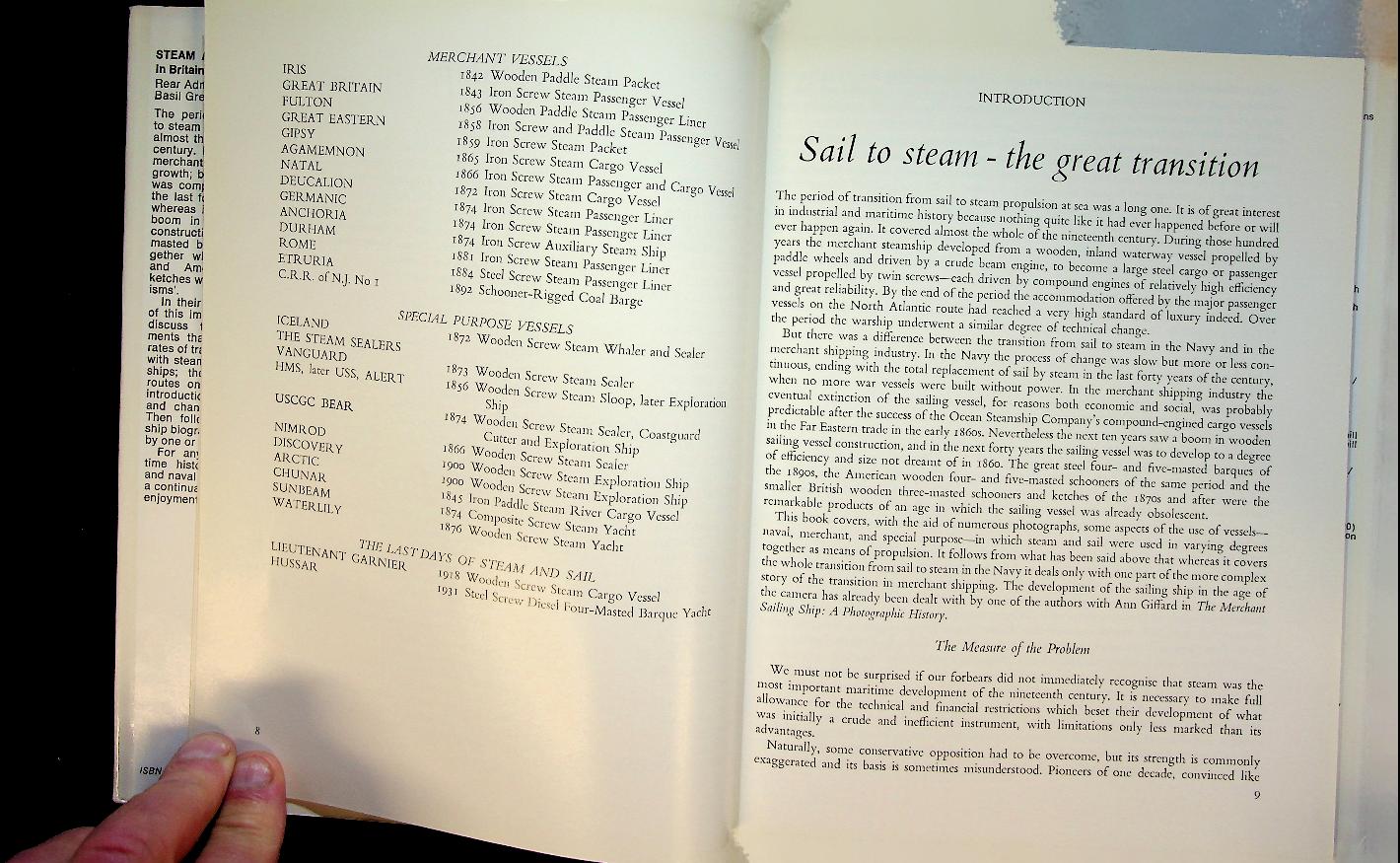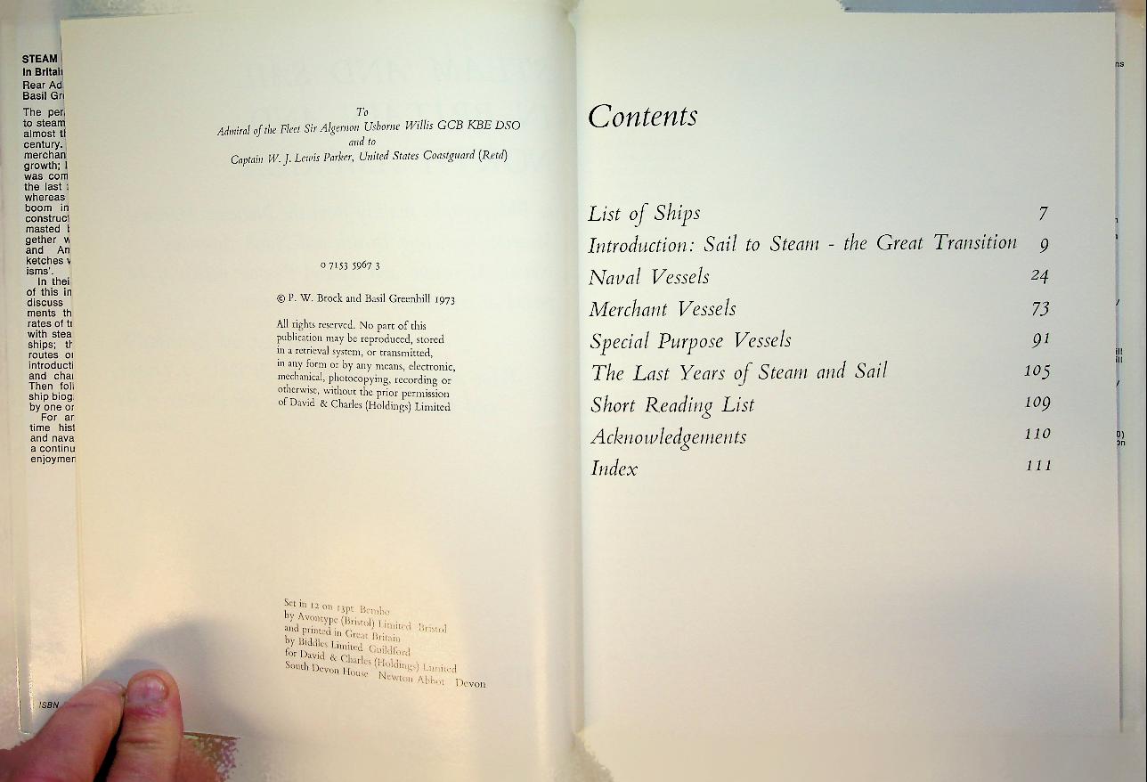 Greenhill, Basil and Rear Admiral P.W. Brock: 1973 UK, hardcover with dust jacket 112 pages, illustrated. Steam and Sail in Britain and North America is an English language photo and reference book by P W Brock (with Basil Greenhill) about the transition from sail to steam in British and North American naval, merchant and special purpose ships, illustrated with around eighty photographs mainly from the National Maritime Museum. The book uses these images with concise captions and background text to show how mixed sail and steam rigs were used on a wide range of vessel types in the nineteenth century, making it a compact visual guide to this hybrid era. ISBN 9780715359679 In good condition