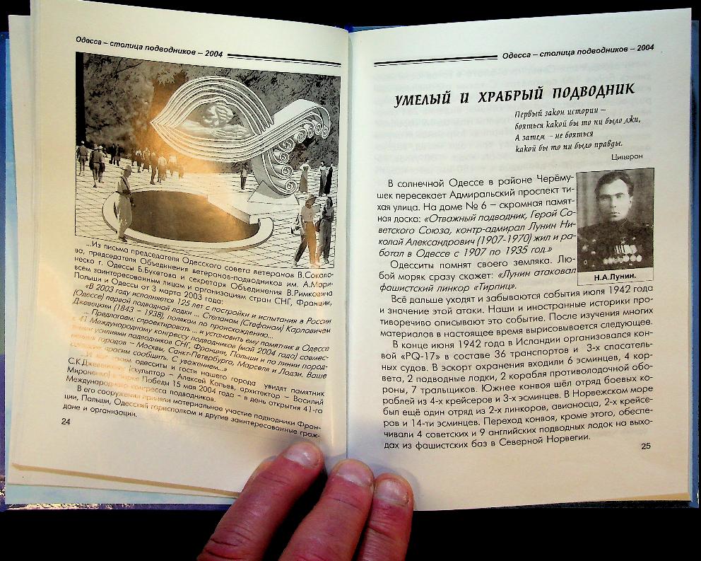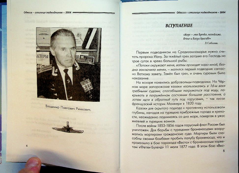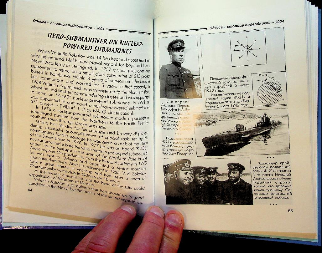 Rimkovich, V.P.: 2004 Odessa Ukraine, hardcover, 114 pages, illustrated. Submariners, Heroes, Odessavites is a commemorative volume about submarine crews connected with the port city of Odessa, focusing on their service in wartime and the remembrance of their deeds. The book combines short biographical sketches, anecdotes and historical episodes, presenting submariners from Odessa more as honored heroes and local figures than as subjects of technical fleet history. ISBN 9789668128370 / 9668128370 Russian-English language Language