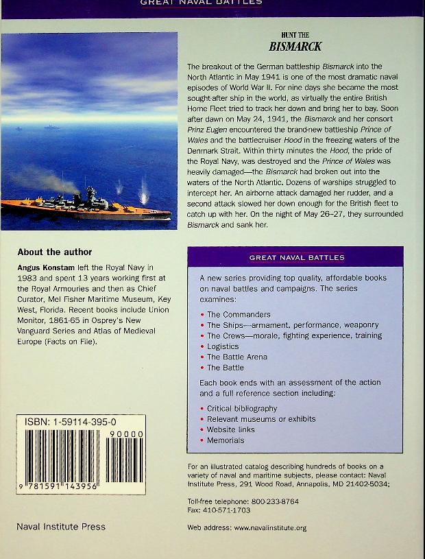 Konstam, A: 2003 Naval Institute Press USA, softcover 96 pages, with photos, maps. Hunt the Bismarck recounts in detail Operation Rheinübung, the breakout of the German battleship Bismarck in May 1941 and the relentless Royal Navy pursuit that ended with her dramatic sinking in the North Atlantic. Konstam combines operational analysis with eyewitness testimony and recent research to cut through the myths surrounding Bismarck and illuminate the tactical and human dimensions of this famous naval campaign. ISBN 9781591143956 In very good condition